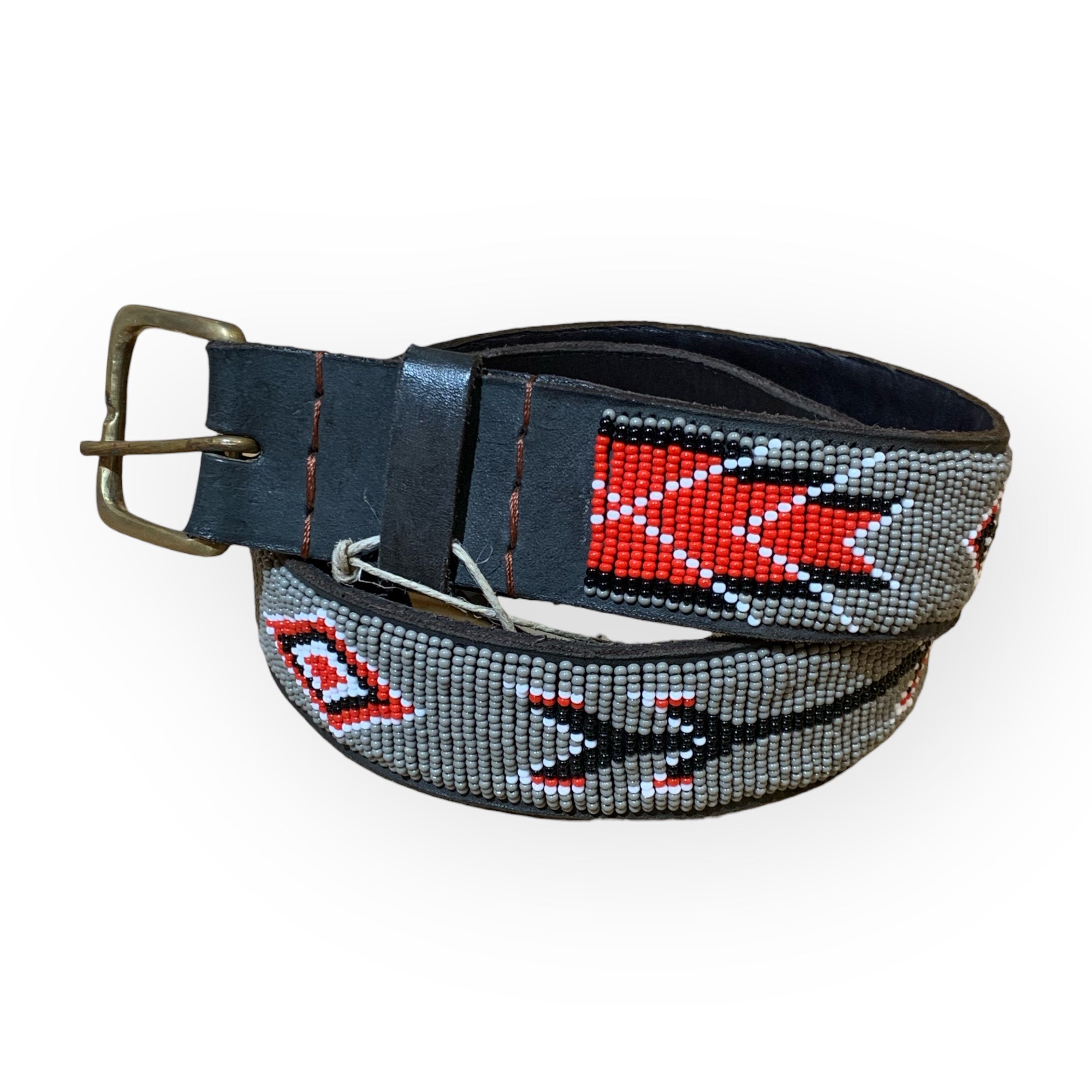 Leather belts are handmade in Kenya by skilled artisans; it often takes an artisan an entire day to complete just the beadwork on a belt. The beads are sewn into the leather with clear fishing line and then secured again with strong thread to ensure the beads stay on for years to come.