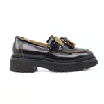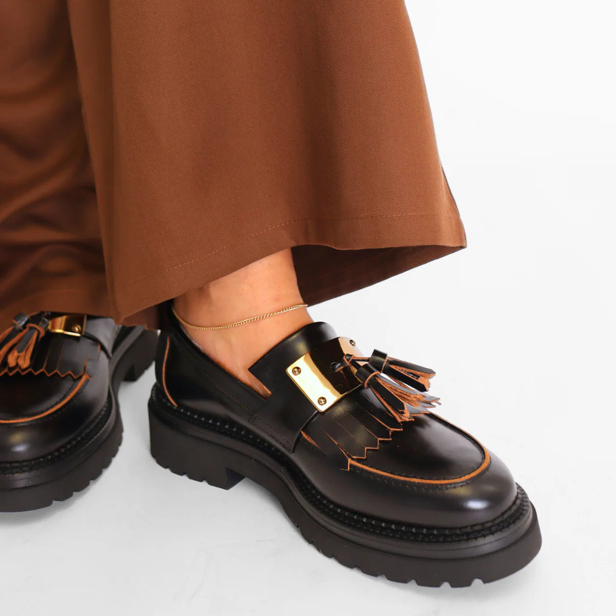 Serving drama, this chunky lug-sole loafer brings a plush shearling-lined interior to a glossy black leather upper, finished with contrast caramel piping, a kiltie fringe and tassels, and a bold gold-tone plate across the vamp. Winter-proof warmth, and the perfect lift for wide-leg trousers, mini skirts, and your fav slouchy socks.