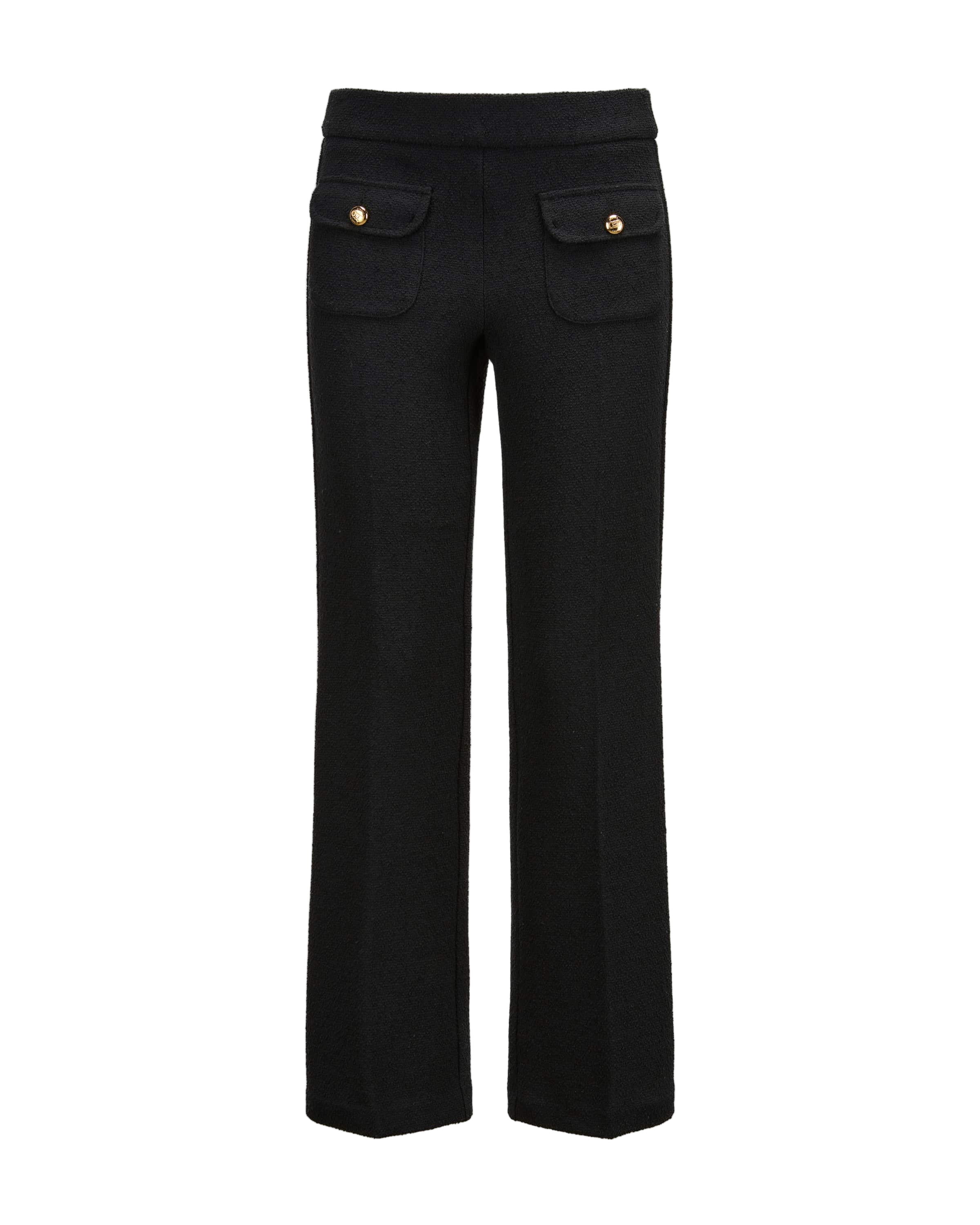This model is a stylish elastic waistband and textured bouclé fabric make this model a stylish companion, while the striking patch flap pockets with gold-colored logo buttons create a modern look. create a modern look.