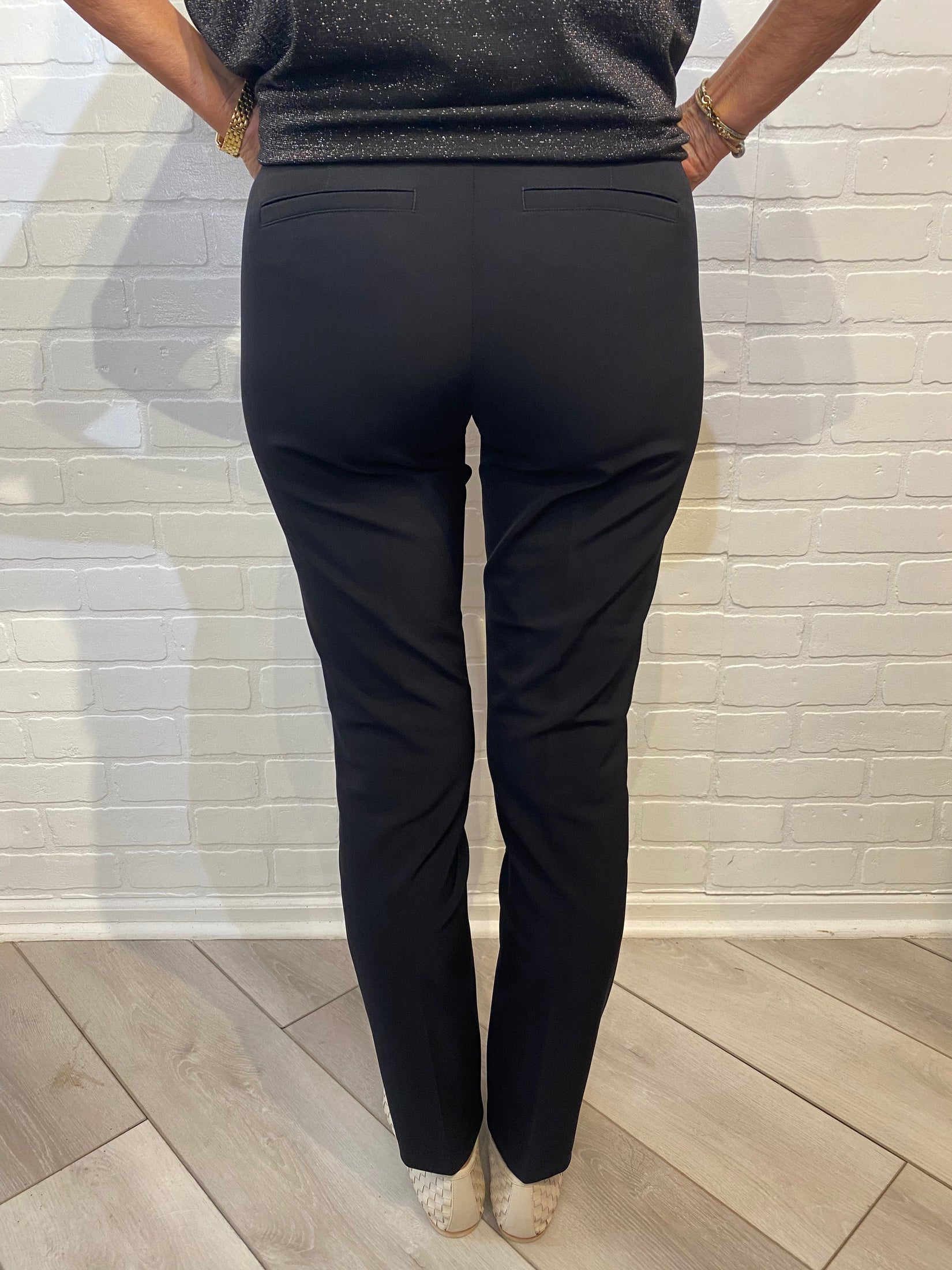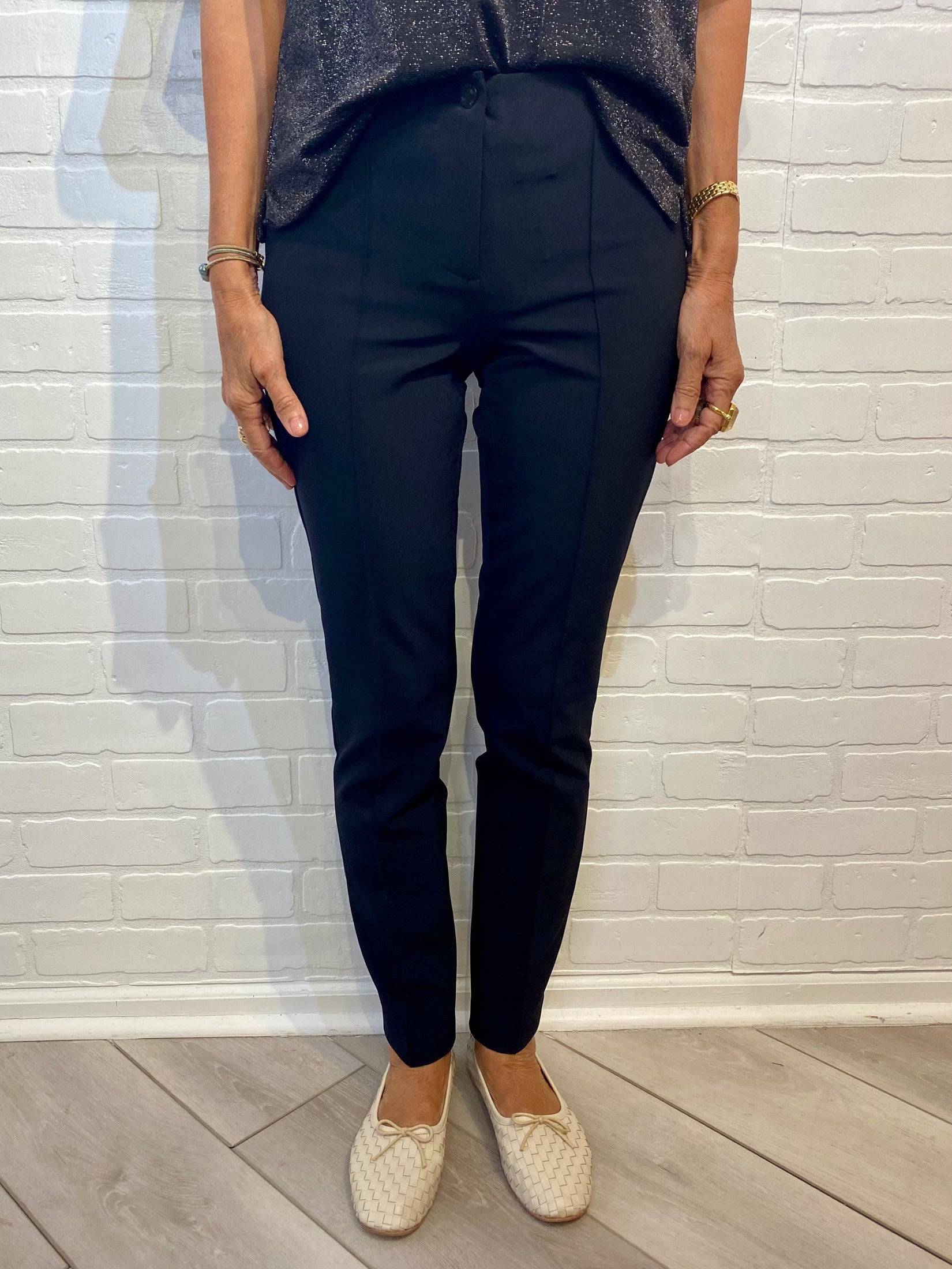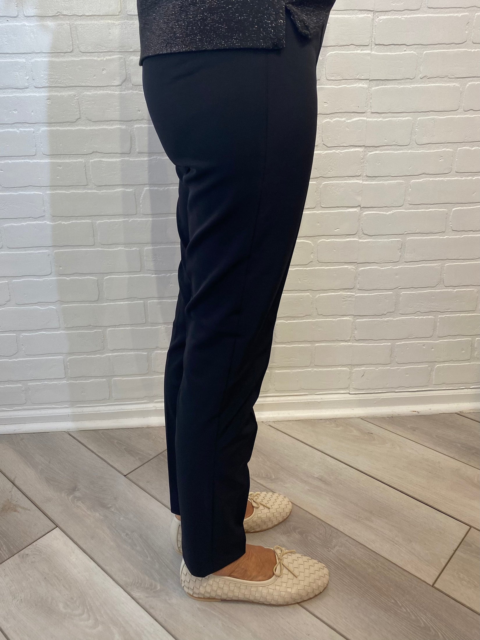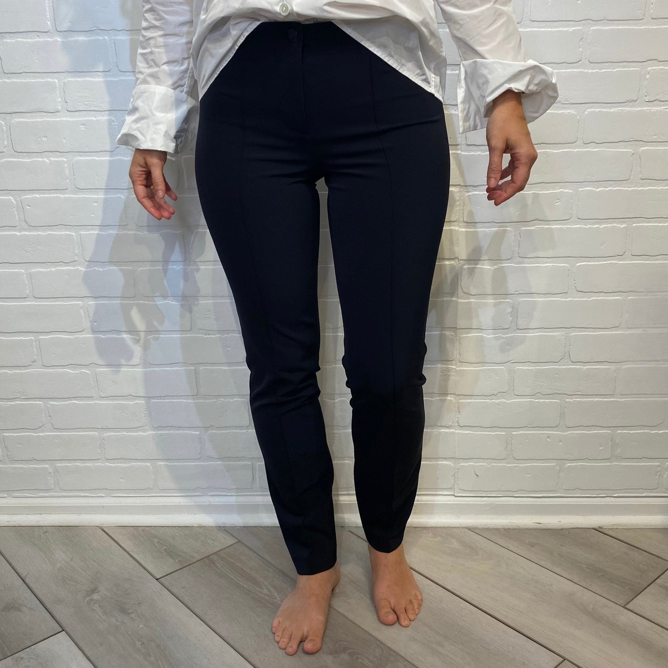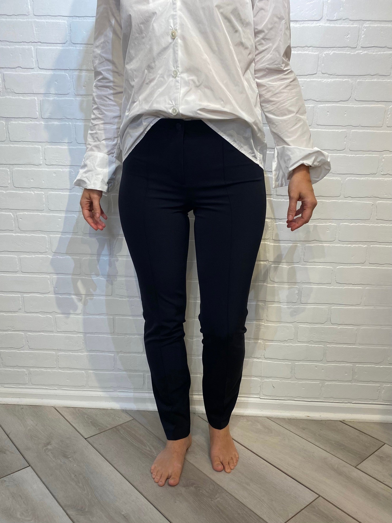 Fitted cigarette leg pant with seam down front center of legs.