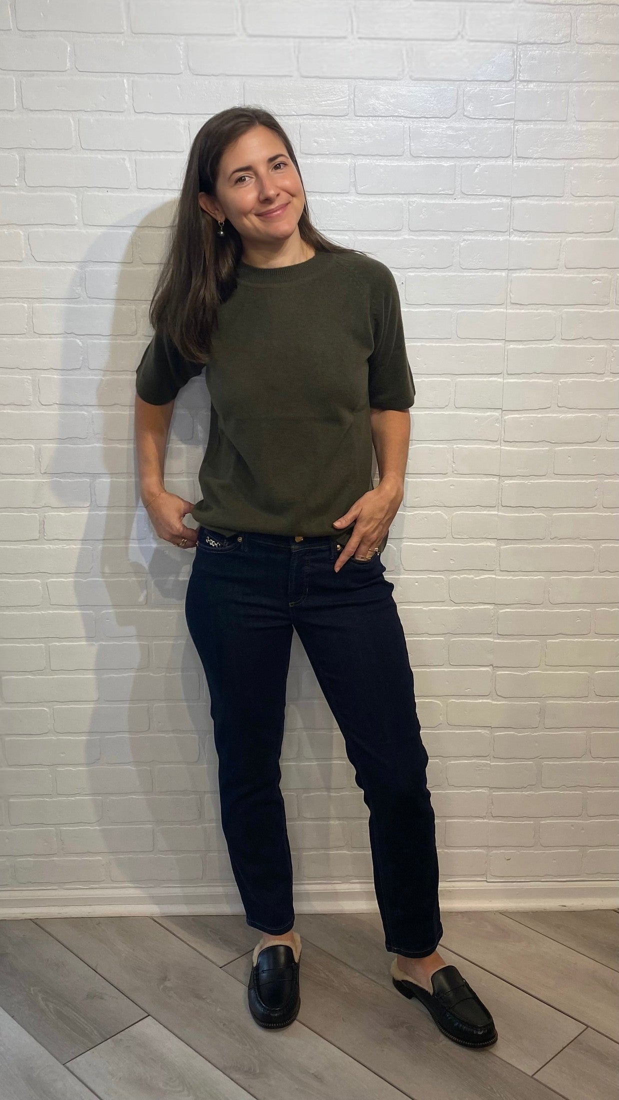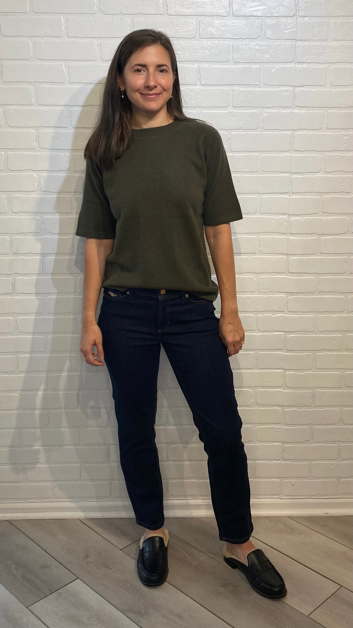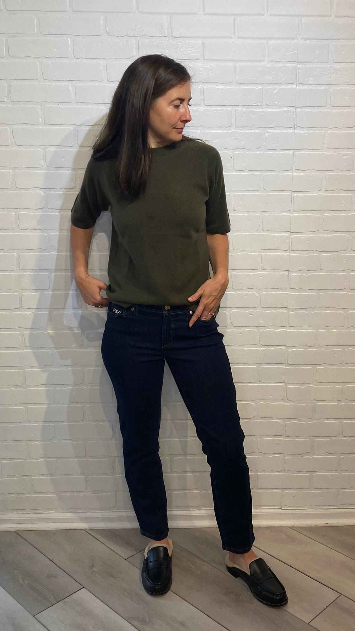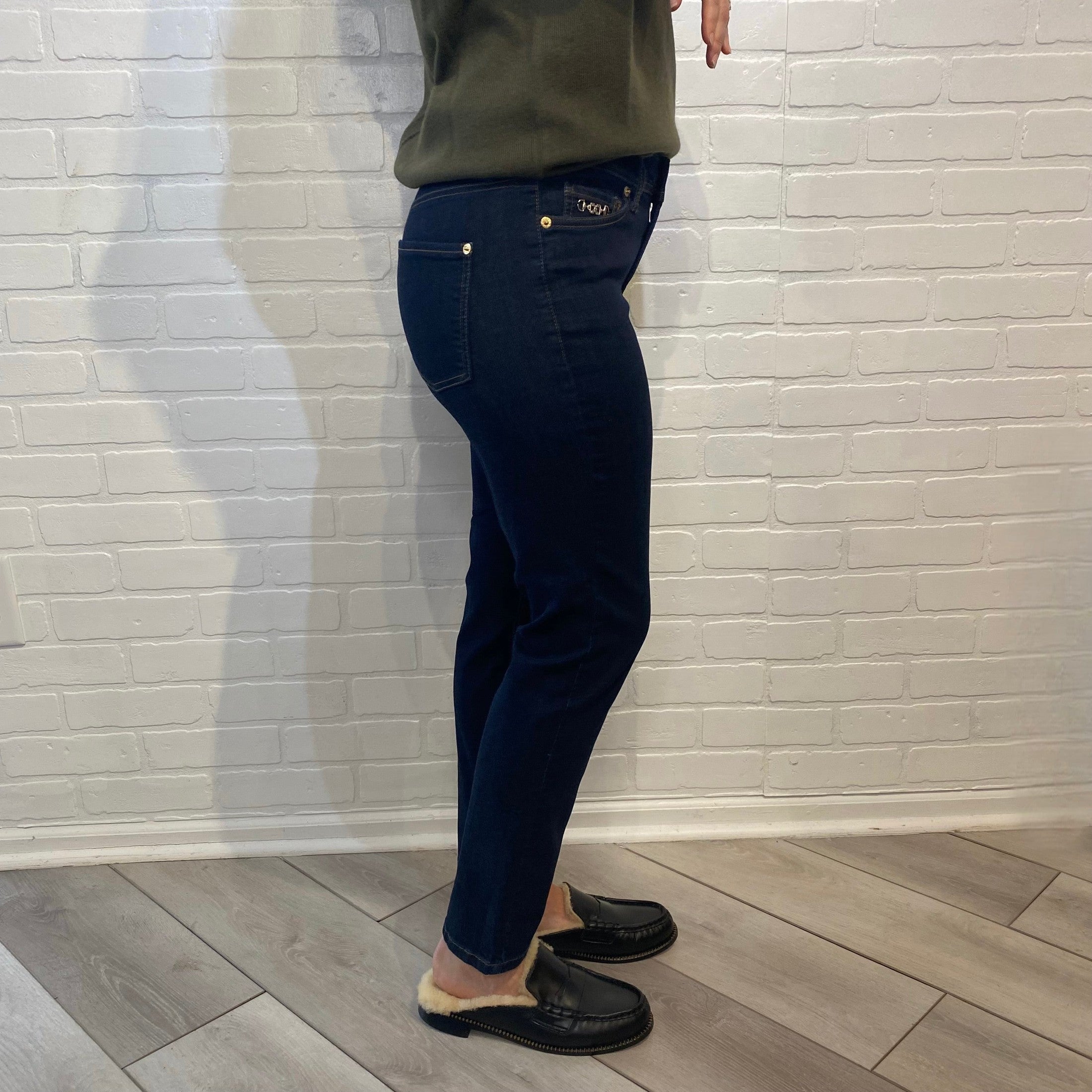 Dark rinse boyfried jean. 93% cotton, 5% poly, 2% elastane