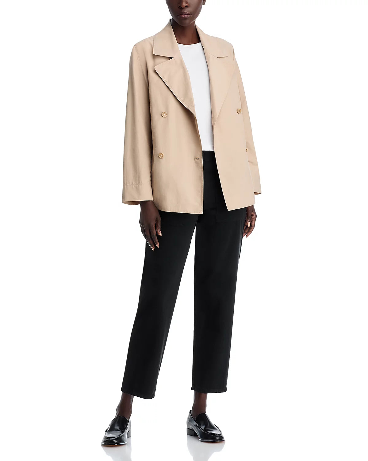 A modern take on a timeless shape. The trench coat with a button front and short silhouette, in a sporty cotton weave made with recycled nylon.