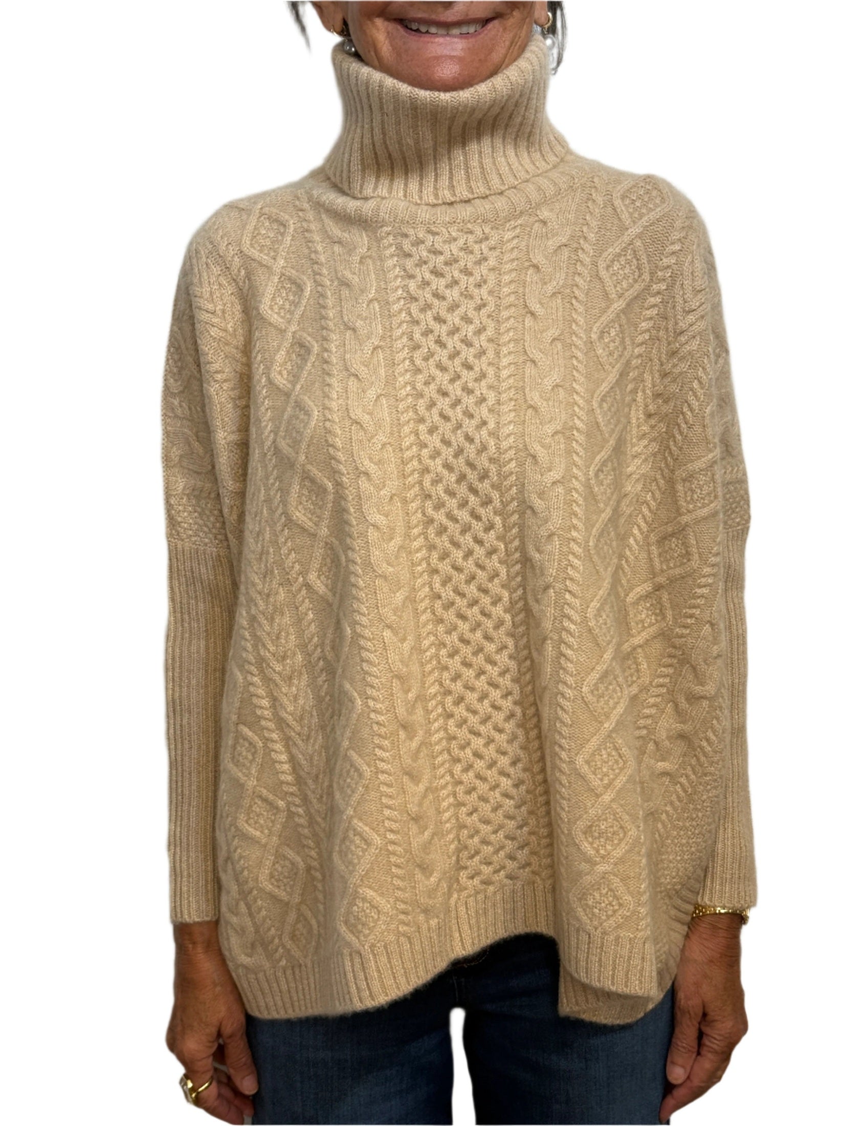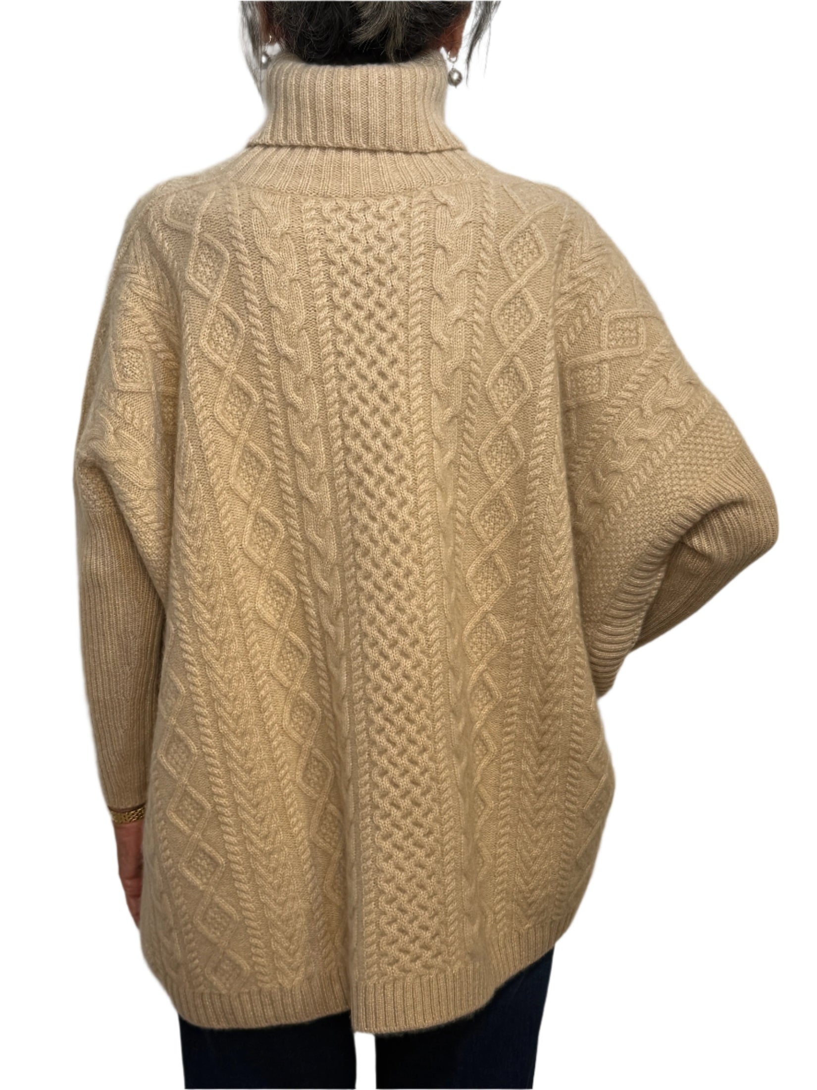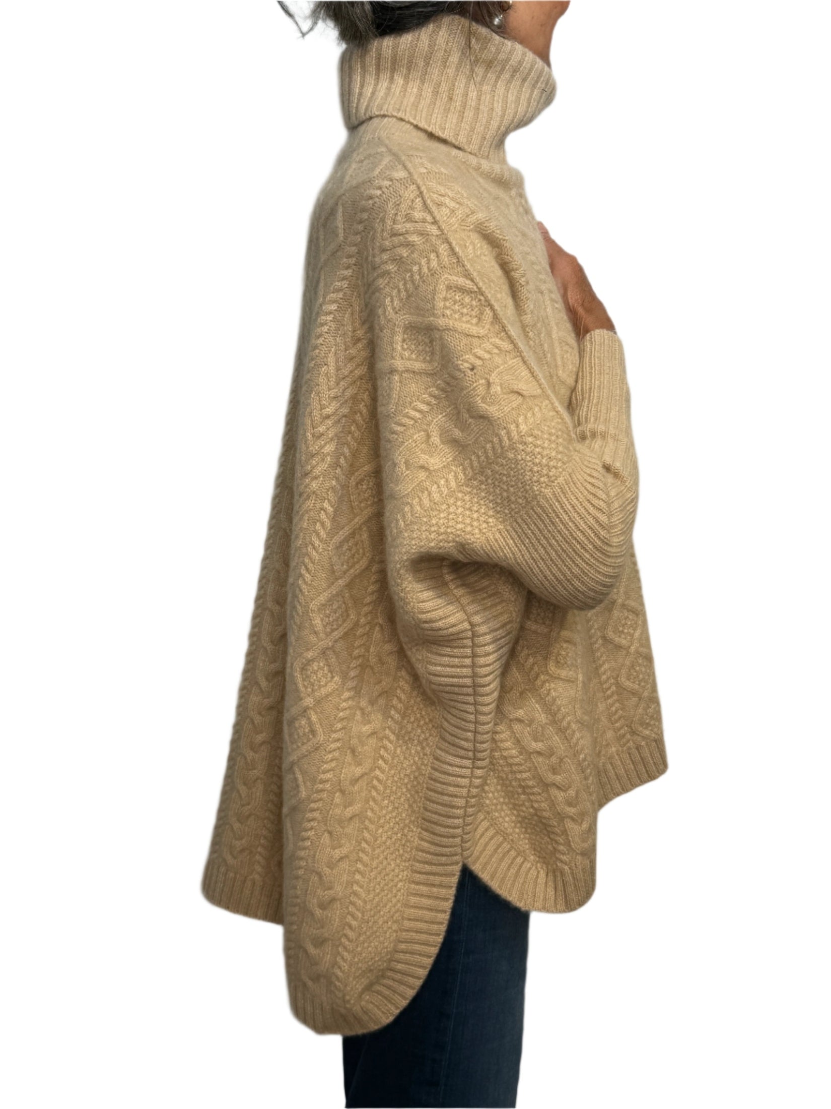 100% cashmere - one size poncho shape with sleeve.