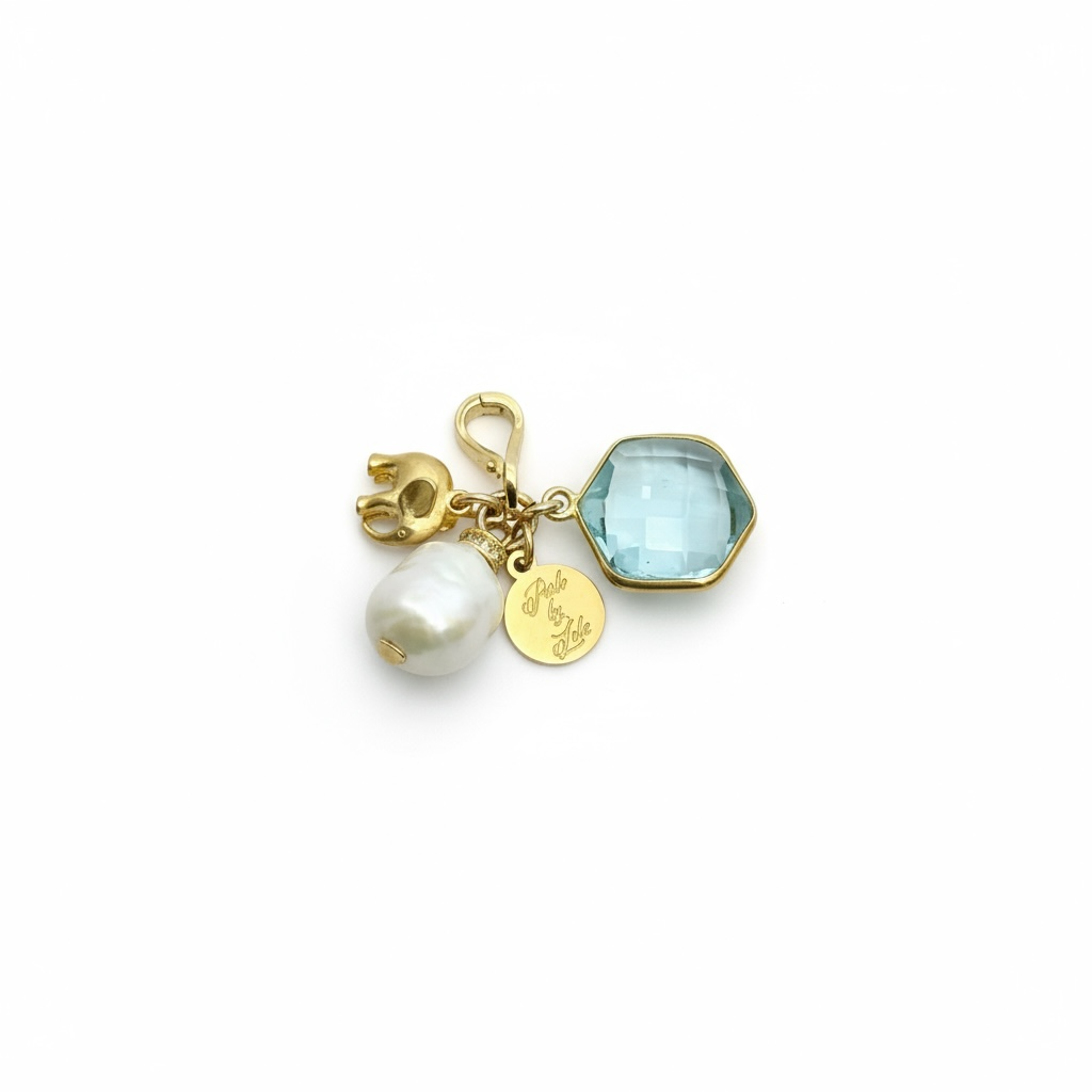 This elegant charm cluster combines a gilded elephant pendant with a lustrous baroque freshwater pearl and a striking blue semi-precious stone, creating a refined layered accent. The versatile design seamlessly integrates with virtually any necklace, allowing you to personalize your jewelry collection with understated sophistication and natural beauty.