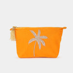 Elevate your beauty routine with this ultra-soft orange velvet pouch, adorned with one palm tree embroidery. It can hold all your essential makeup products and easily fits into your suitcase or tote for work.