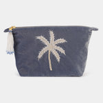 Elevate your beauty routine with this ultra-soft blue velvet pouch, embroidered with palm trees and infused with summer vibes. It holds all your makeup essentials and slips easily into your suitcase or everyday tote.