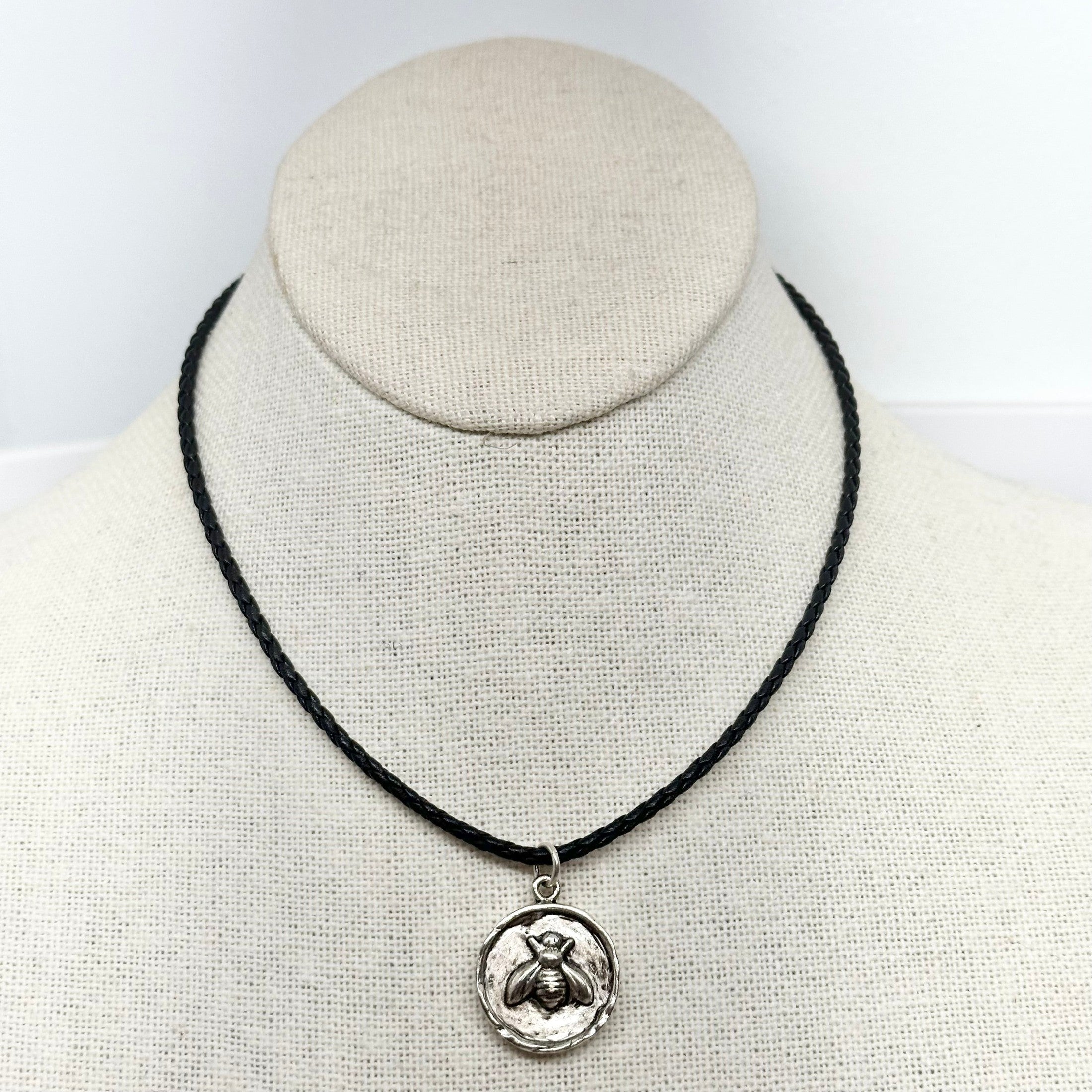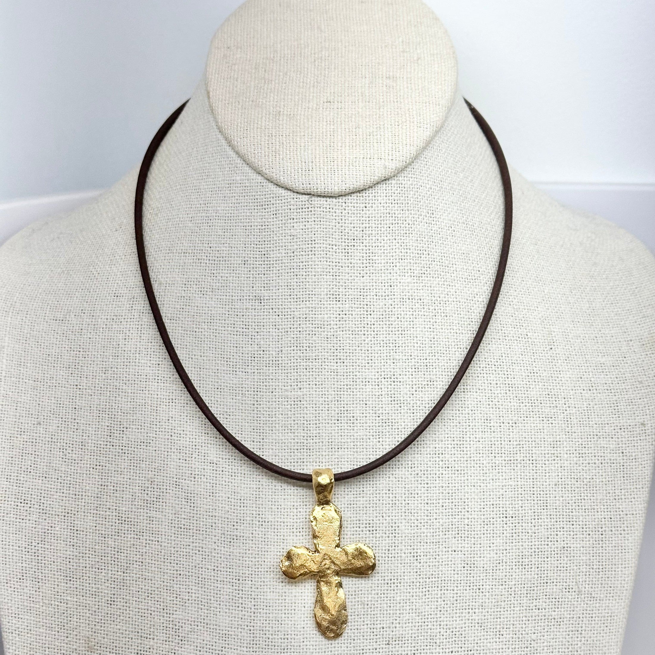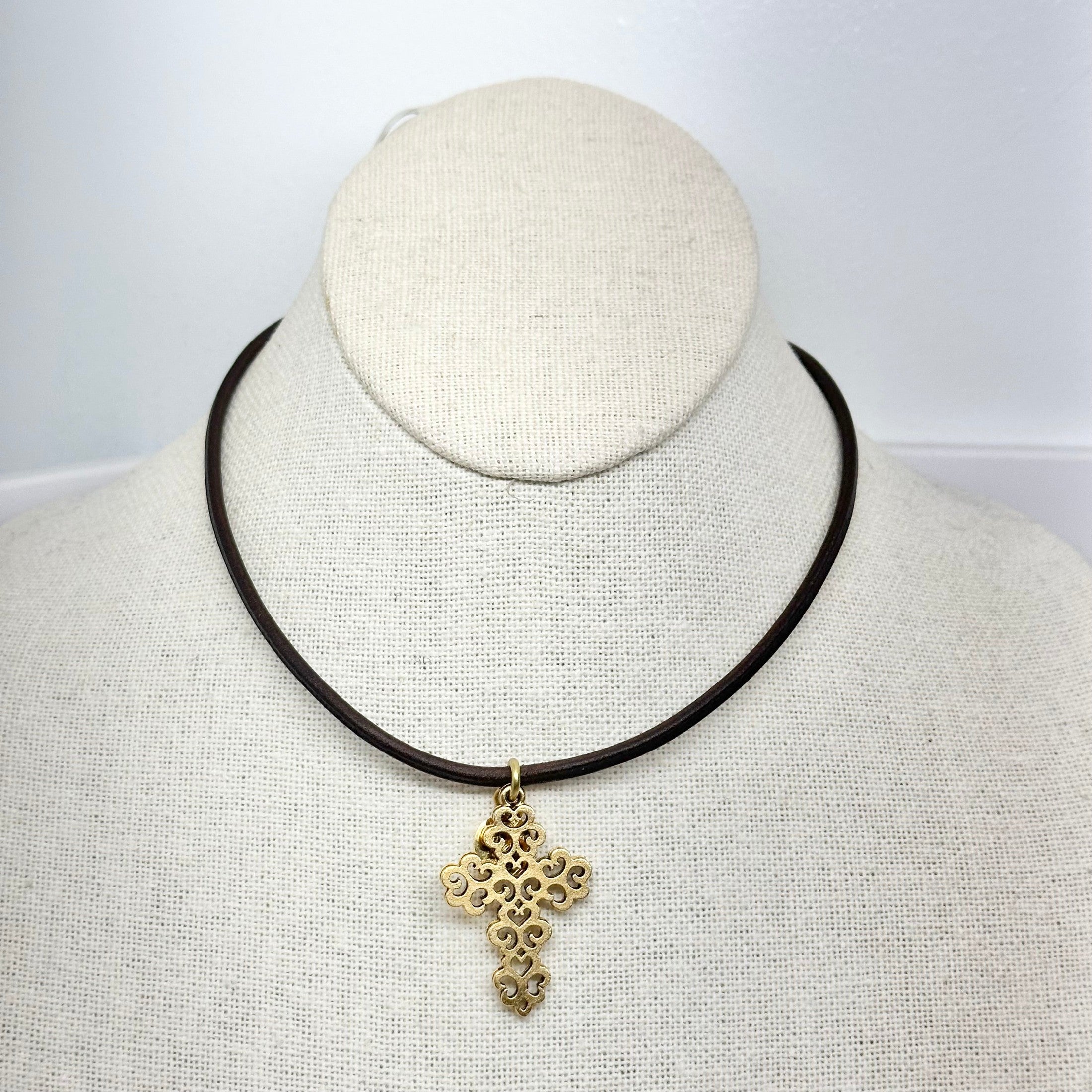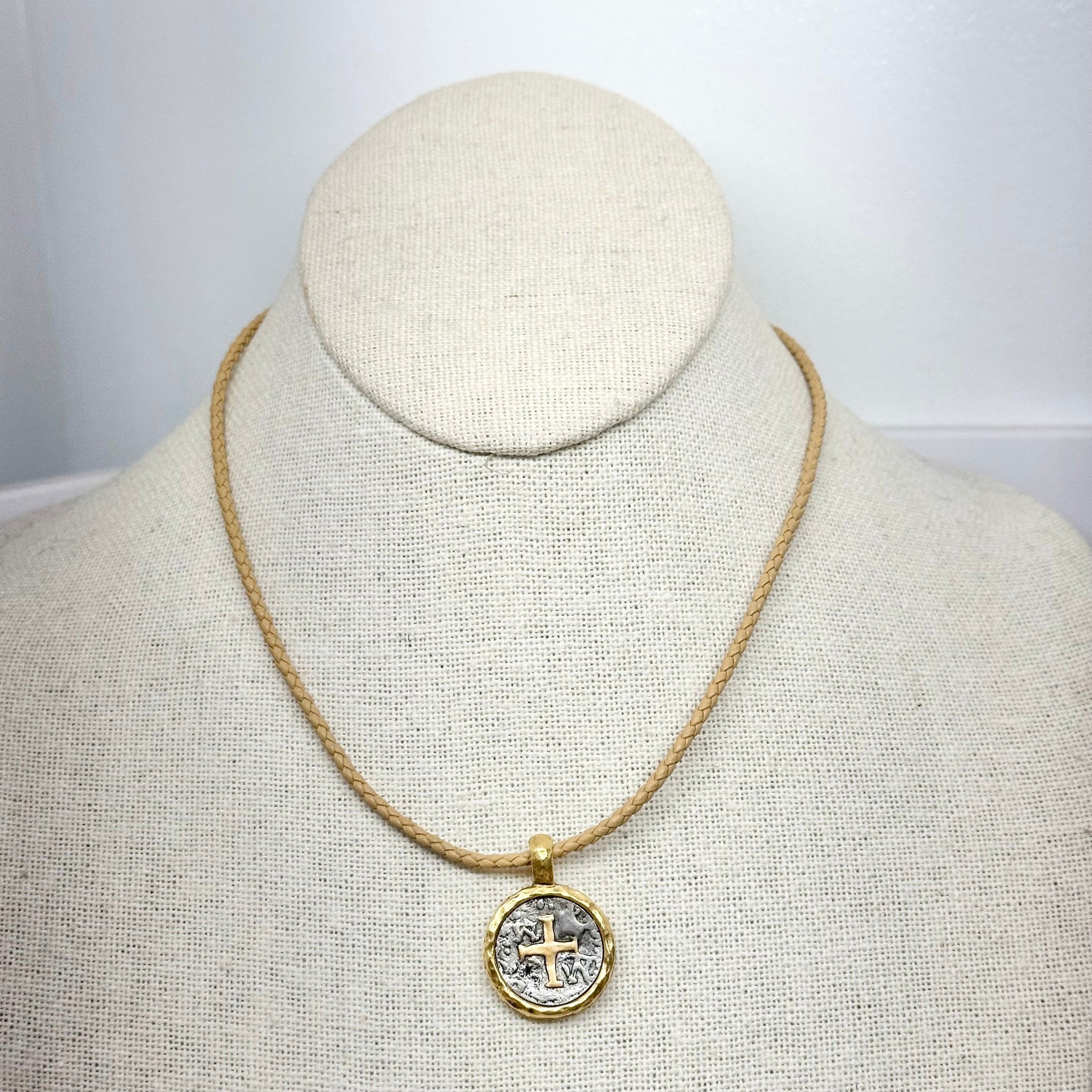 Plated Coin w/ Cross on Braided Leather Choker | 16"