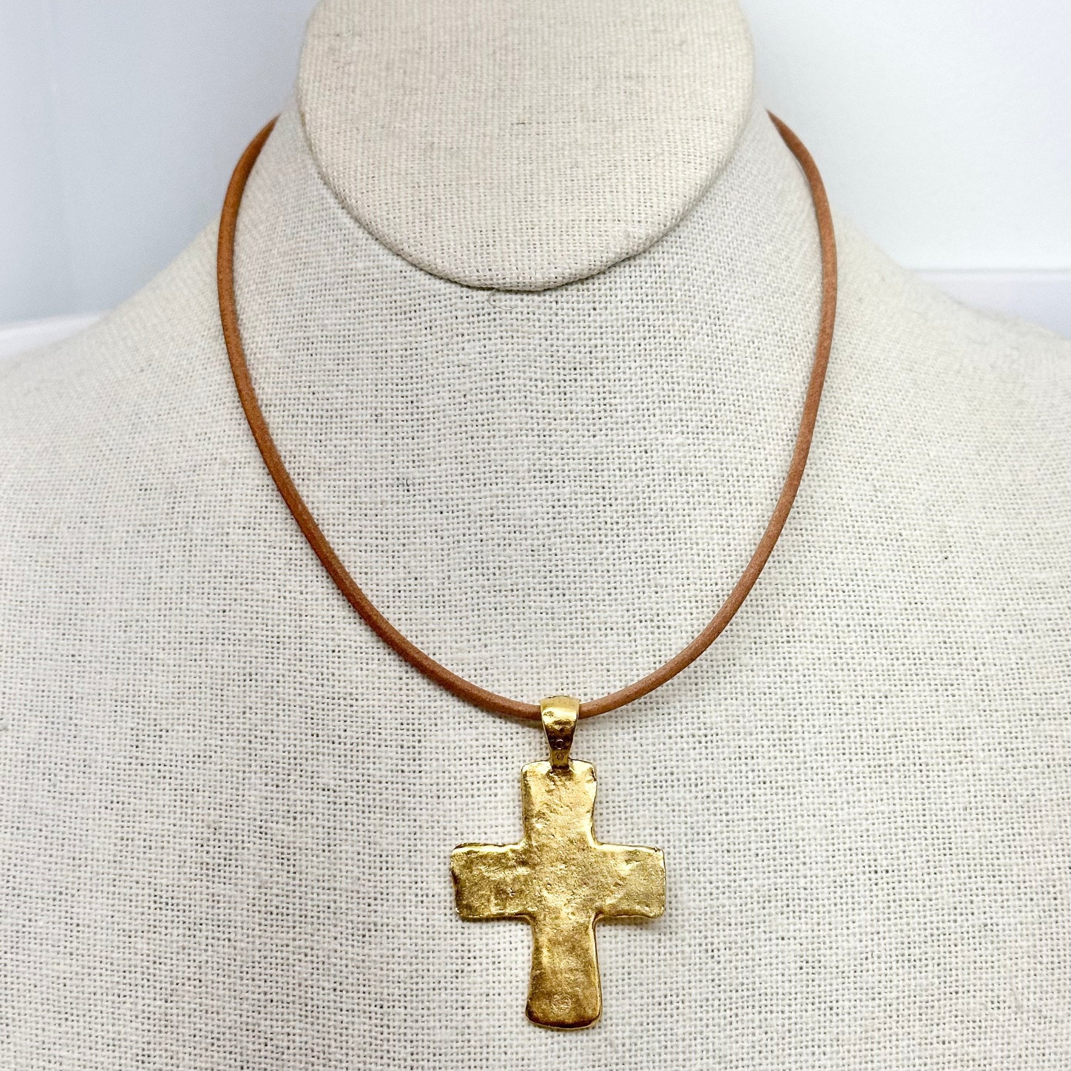16.5" hammered gold toned cross choker on leather