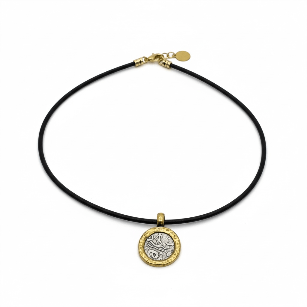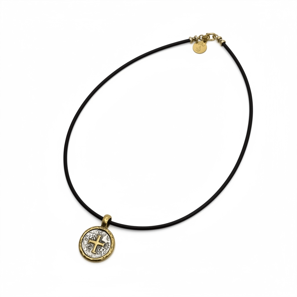Dual-finish coin pendant suspended on rich dark brown leather—an understated essential for effortless layering and refined everyday elegance.