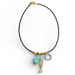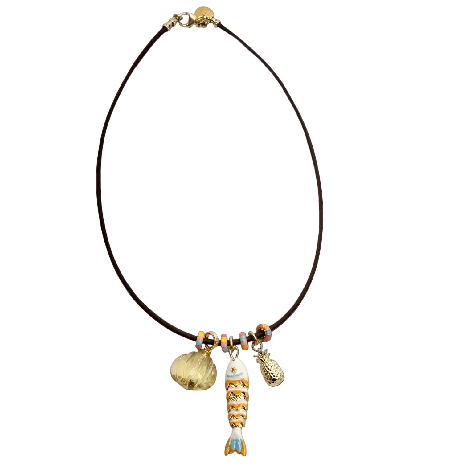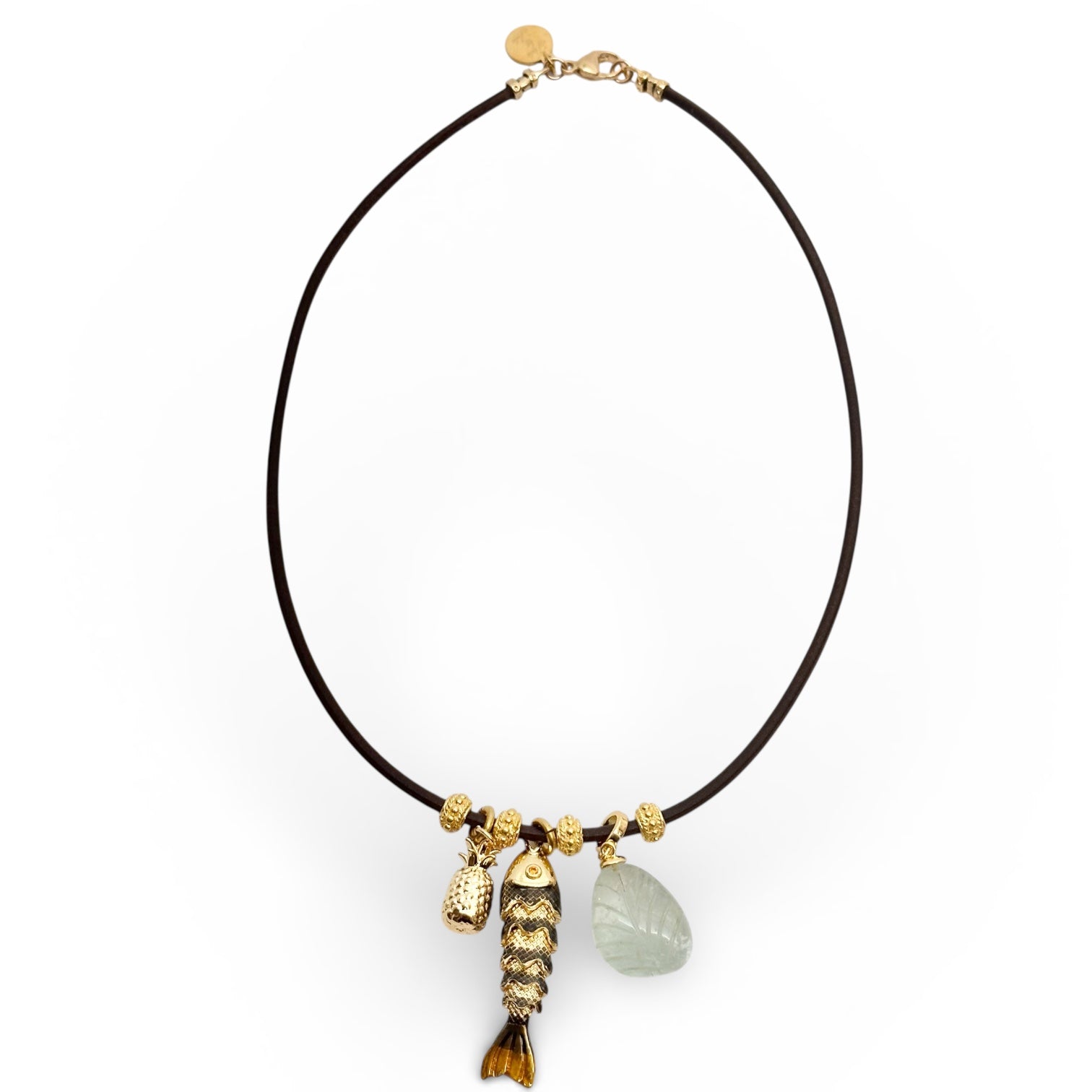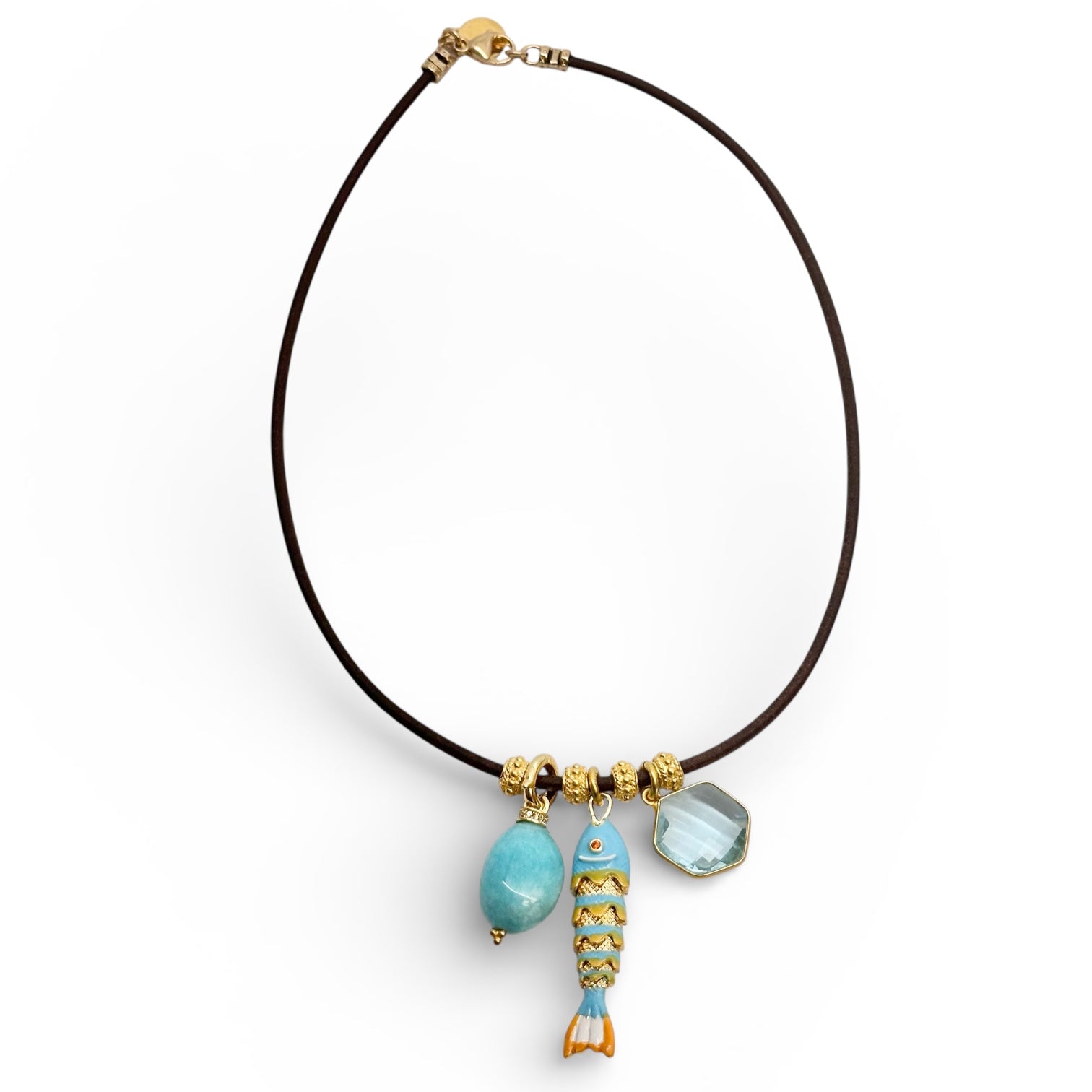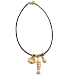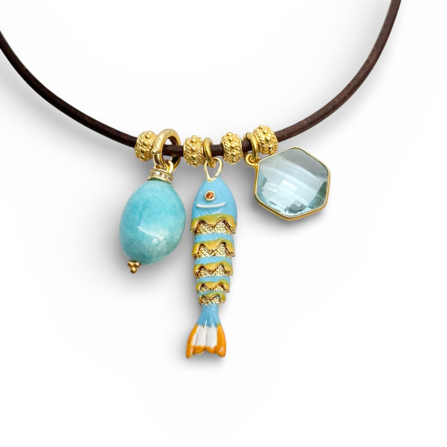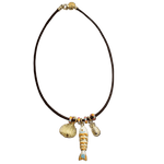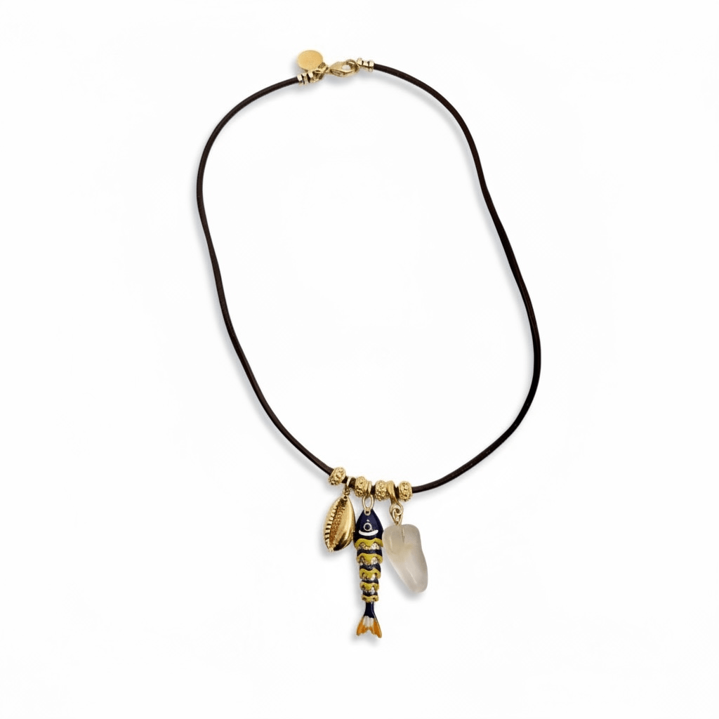 Delicate fish pendant paired with complementary accent charms, strung on rich dark brown leather. This versatile necklace offers three distinct styling options, each crafted to elevate everyday wear with understated elegance. At 17 inches, it sits perfectly at the collarbone for a refined, timeless look.