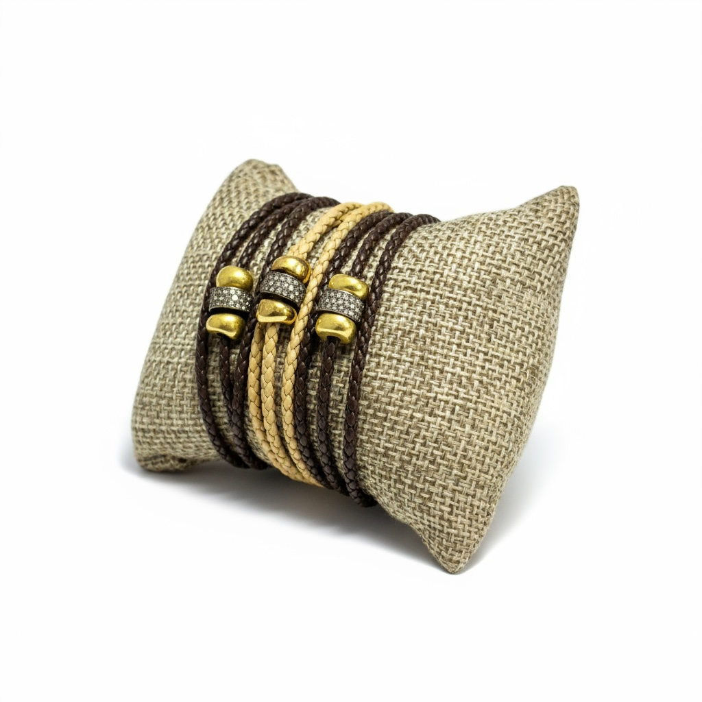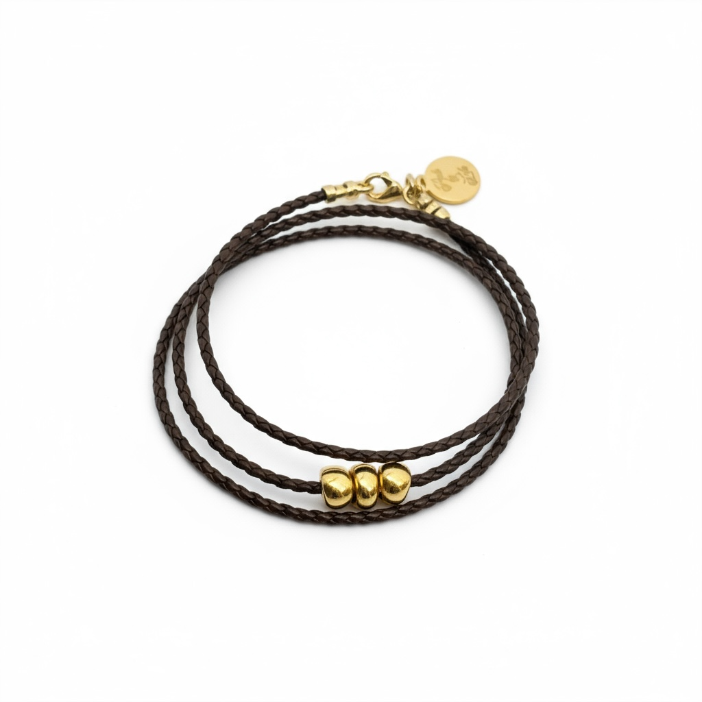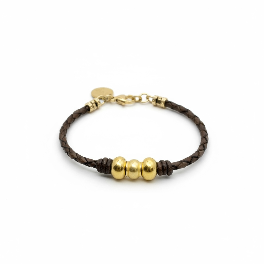 3 Gold Roundels on Braided Leather Bracelet