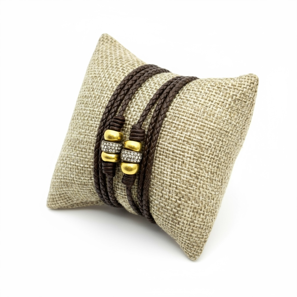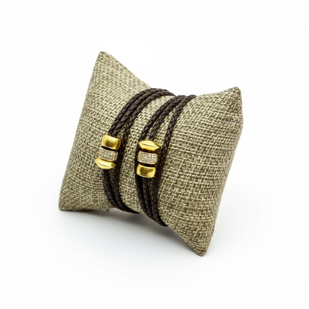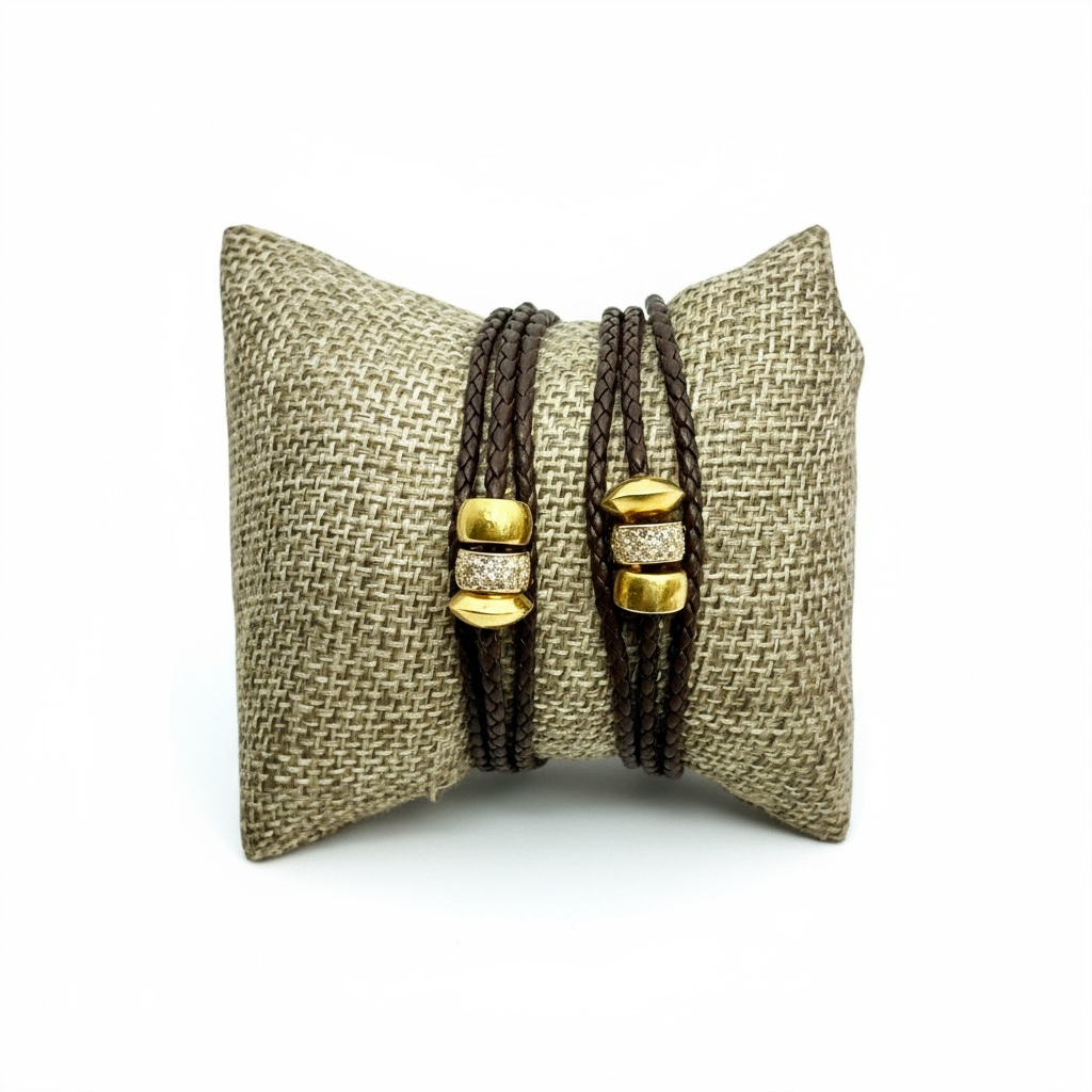 3 Gold Roundels on Braided Leather Bracelet