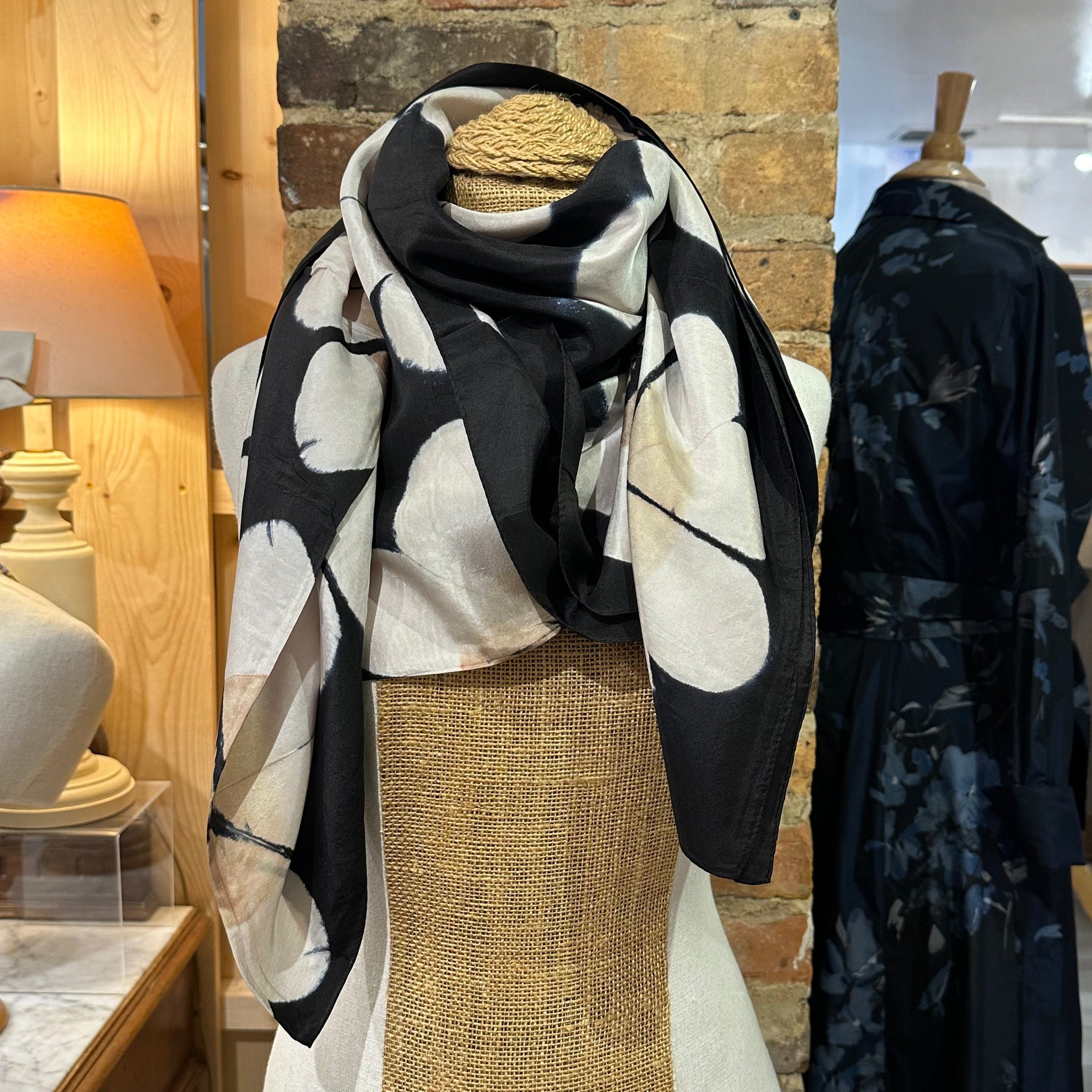 "NAIVE", a silk bandana, using an artisanal dye process to create these geometric shapes. Made in a luxurious silk twill. Hand rolled.