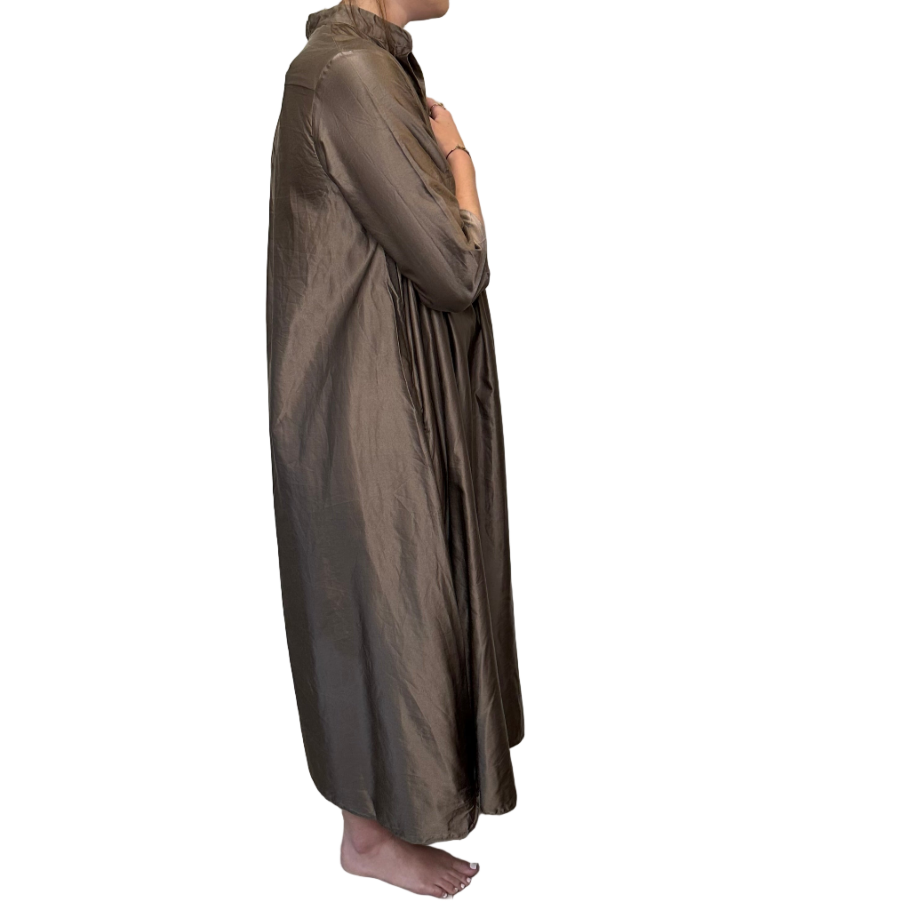 Easy to wear calf length dress with 3/4 length sleeves. hand sewn tab on the front opening and 2 side seam pockets, making it even more practical. easy to wear loose fitting silk dress, the cotton and silk mix makes the dress more durable while keeping its satiny shine.