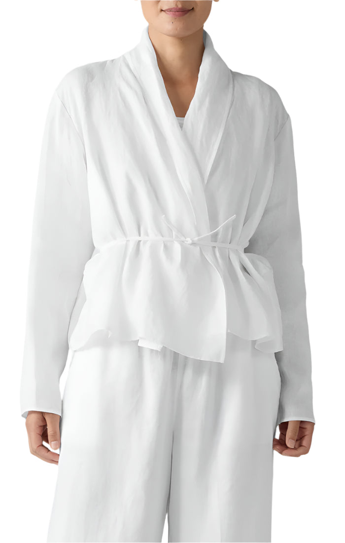 Simple and sophisticated. An airy jacket with a folded high collar and open front in our lightest organic linen—layer it over everything.
