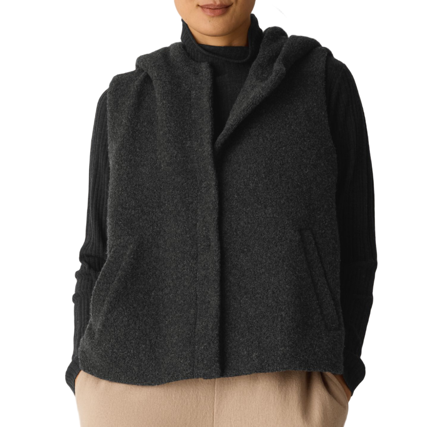 The go-to layering piece you'll reach for all season. A cozy hooded vest with snap buttons and pockets. In a soft boucle knit made from recycled wool. Made in a Fair Trade Certified™ factory.