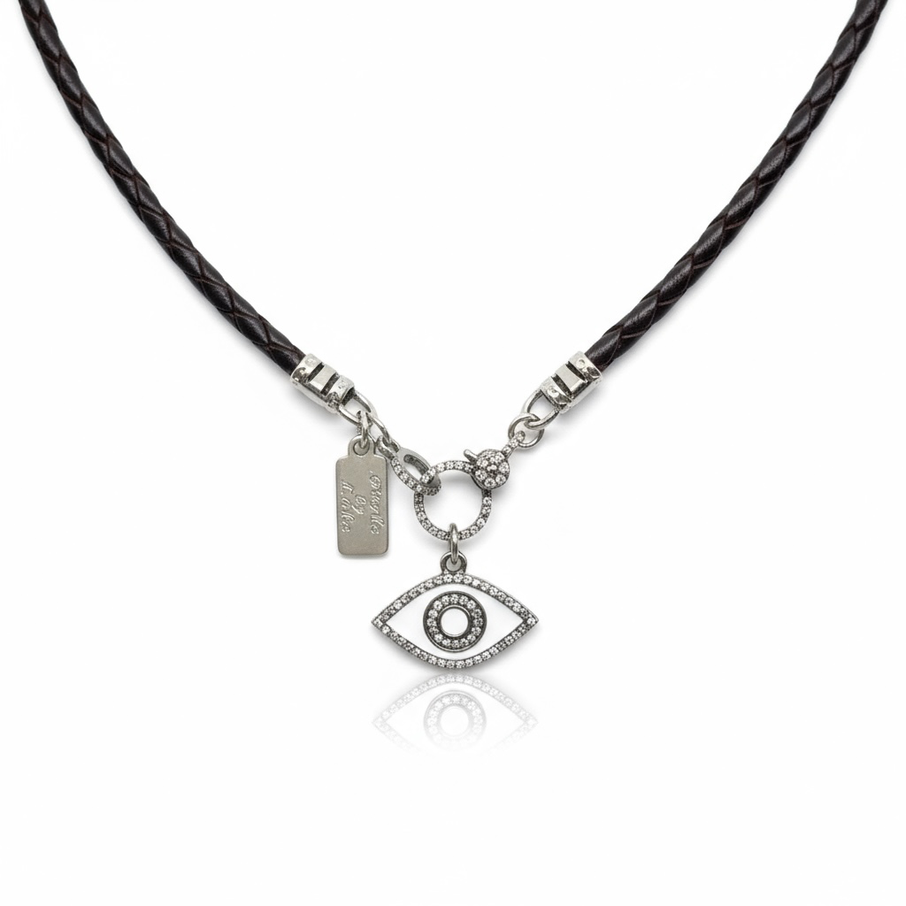 white enamel evil eye pendant with silver, pave diamonds, and silver loop.