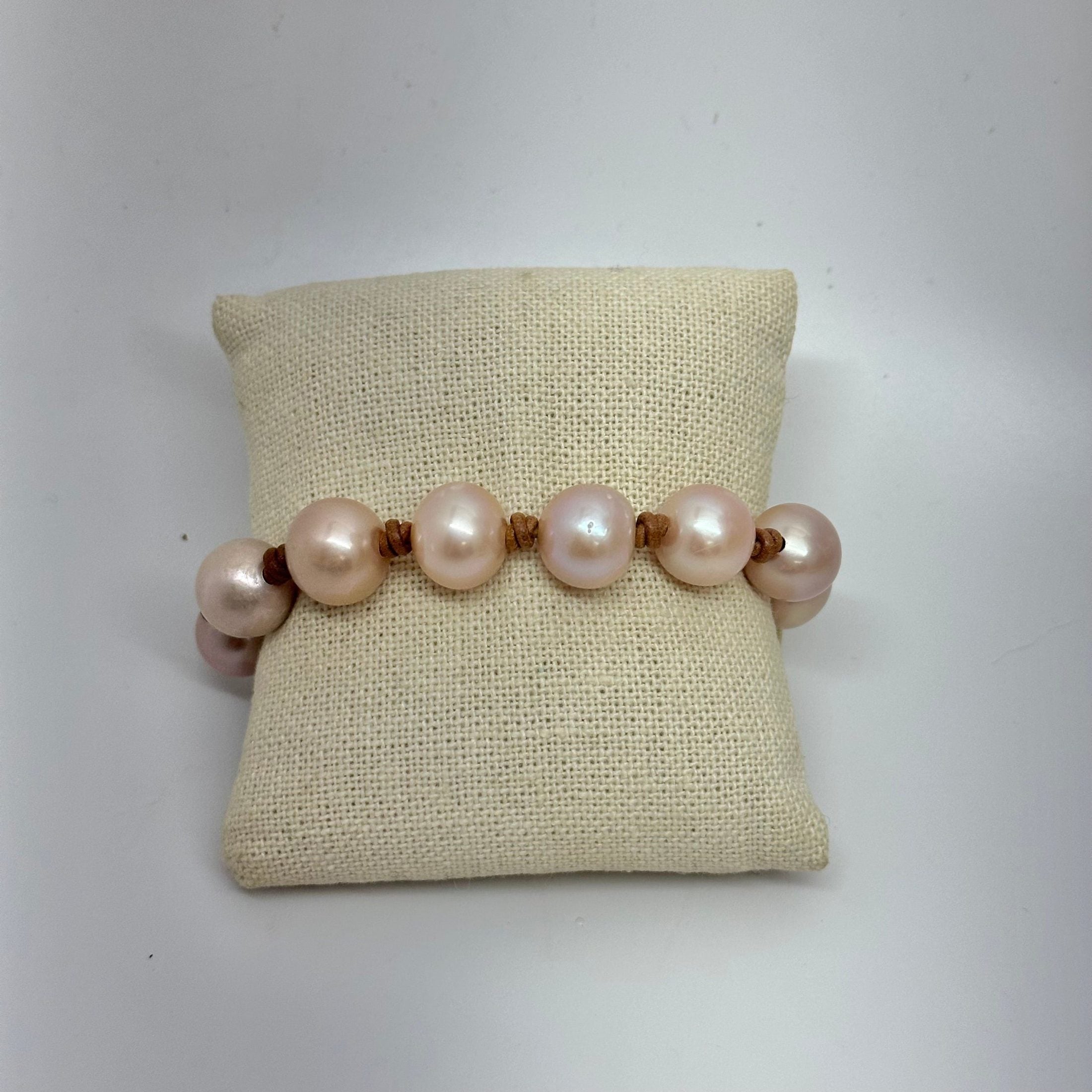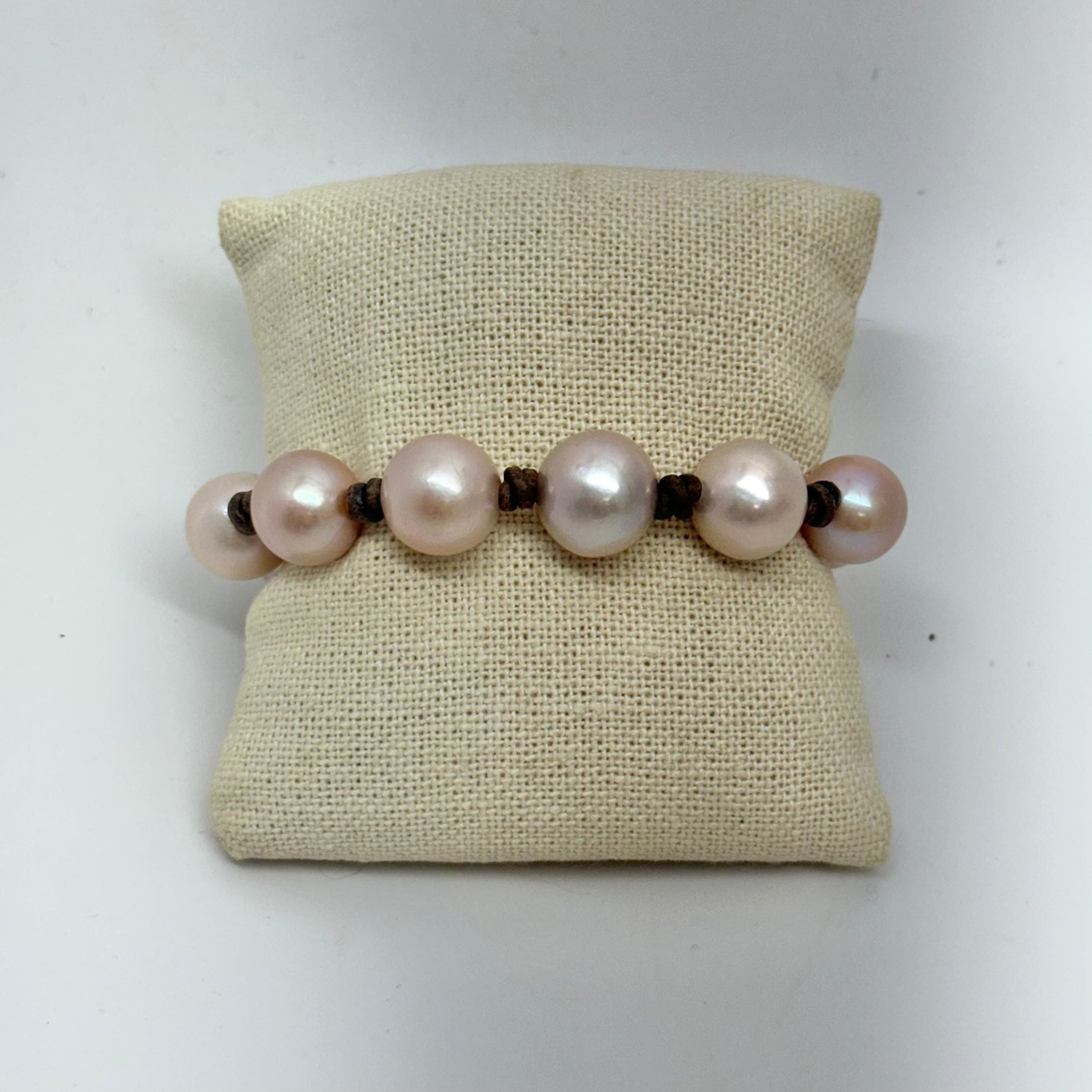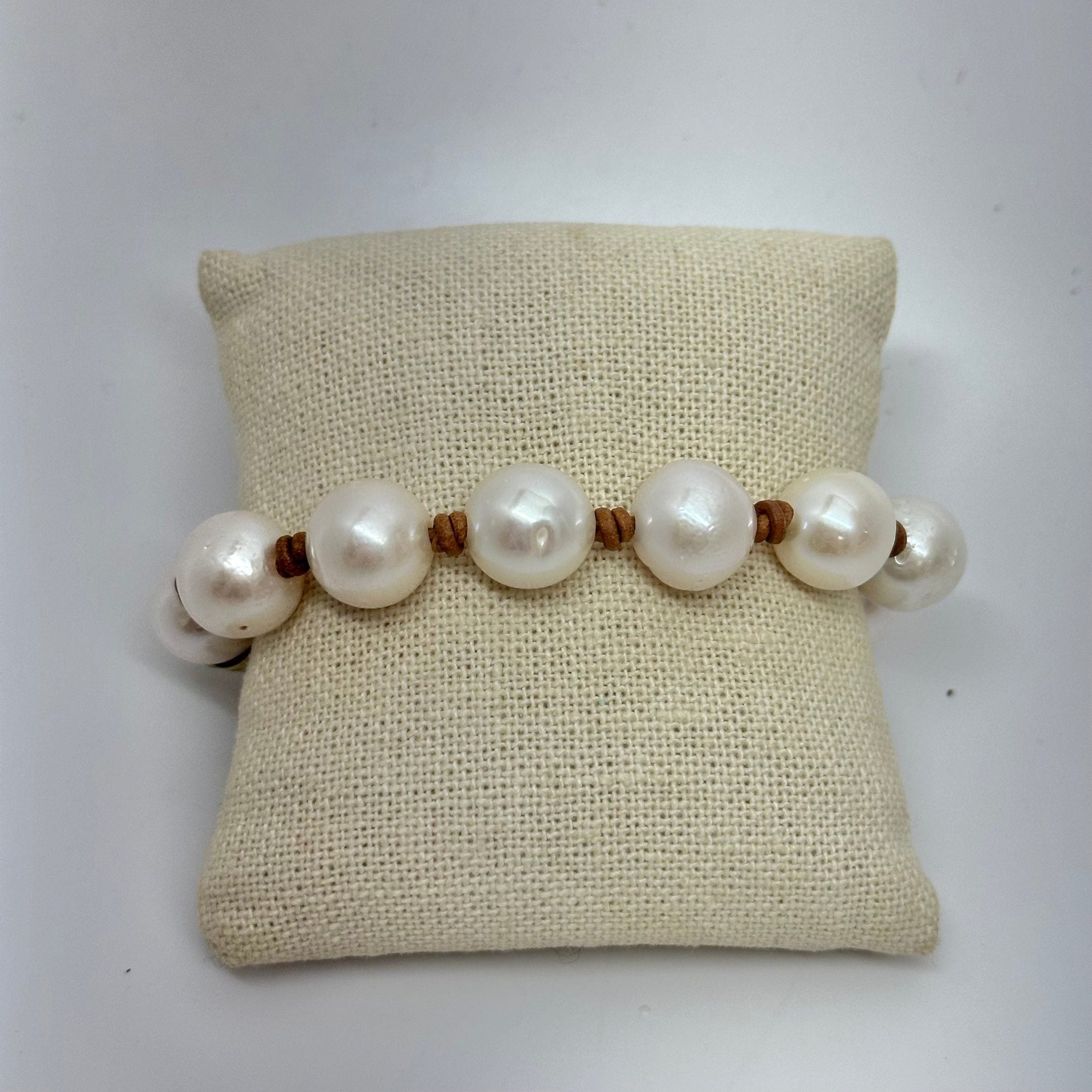 Beautiful Edison Pearls on leather with knots closed by a pearl going through a leather toggle.