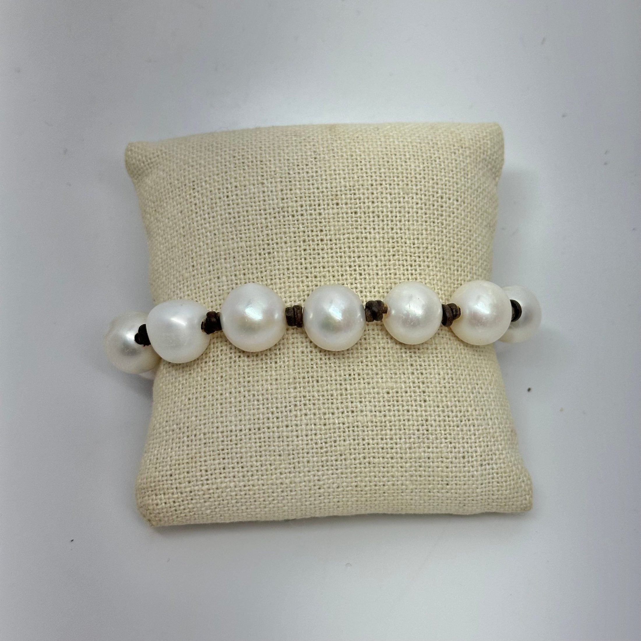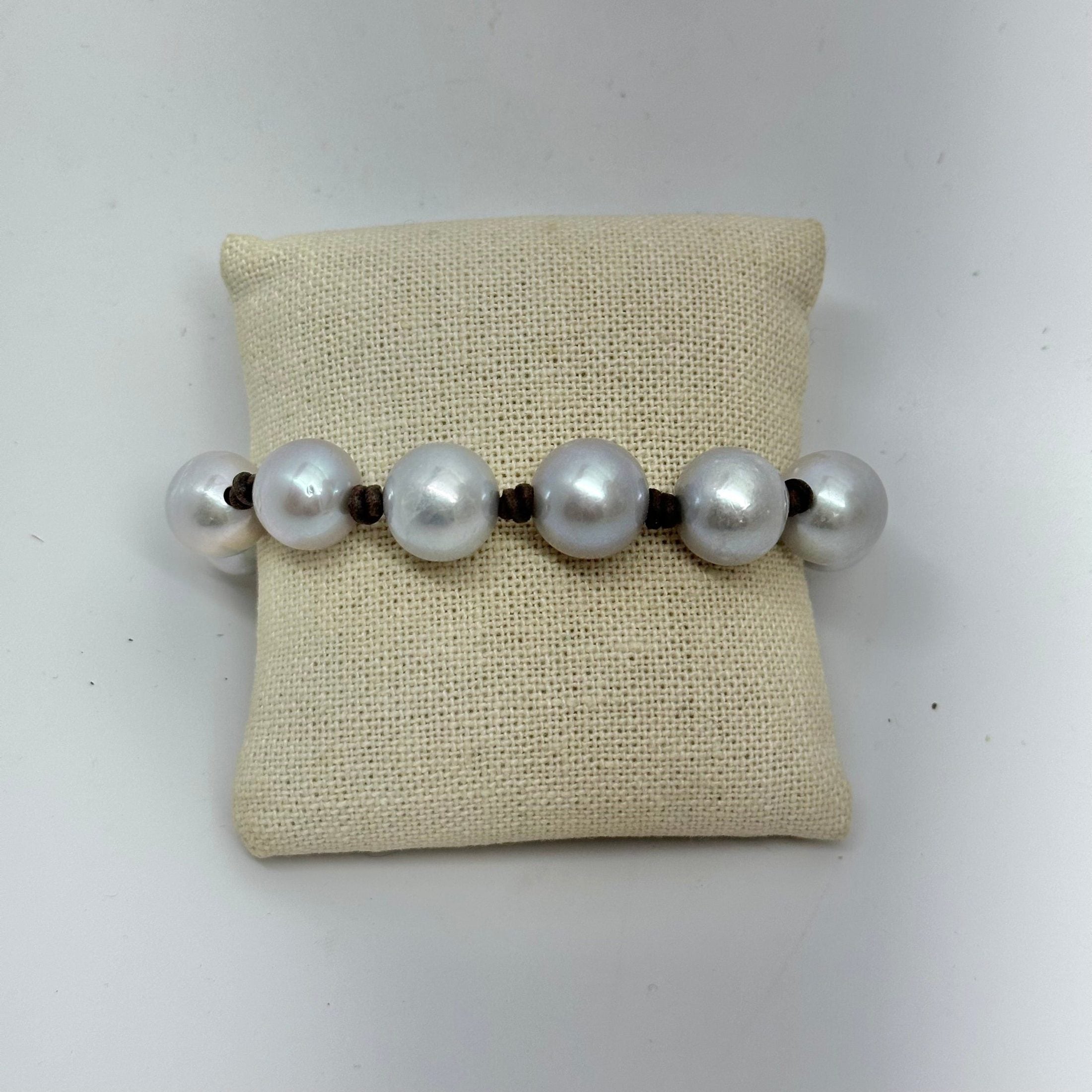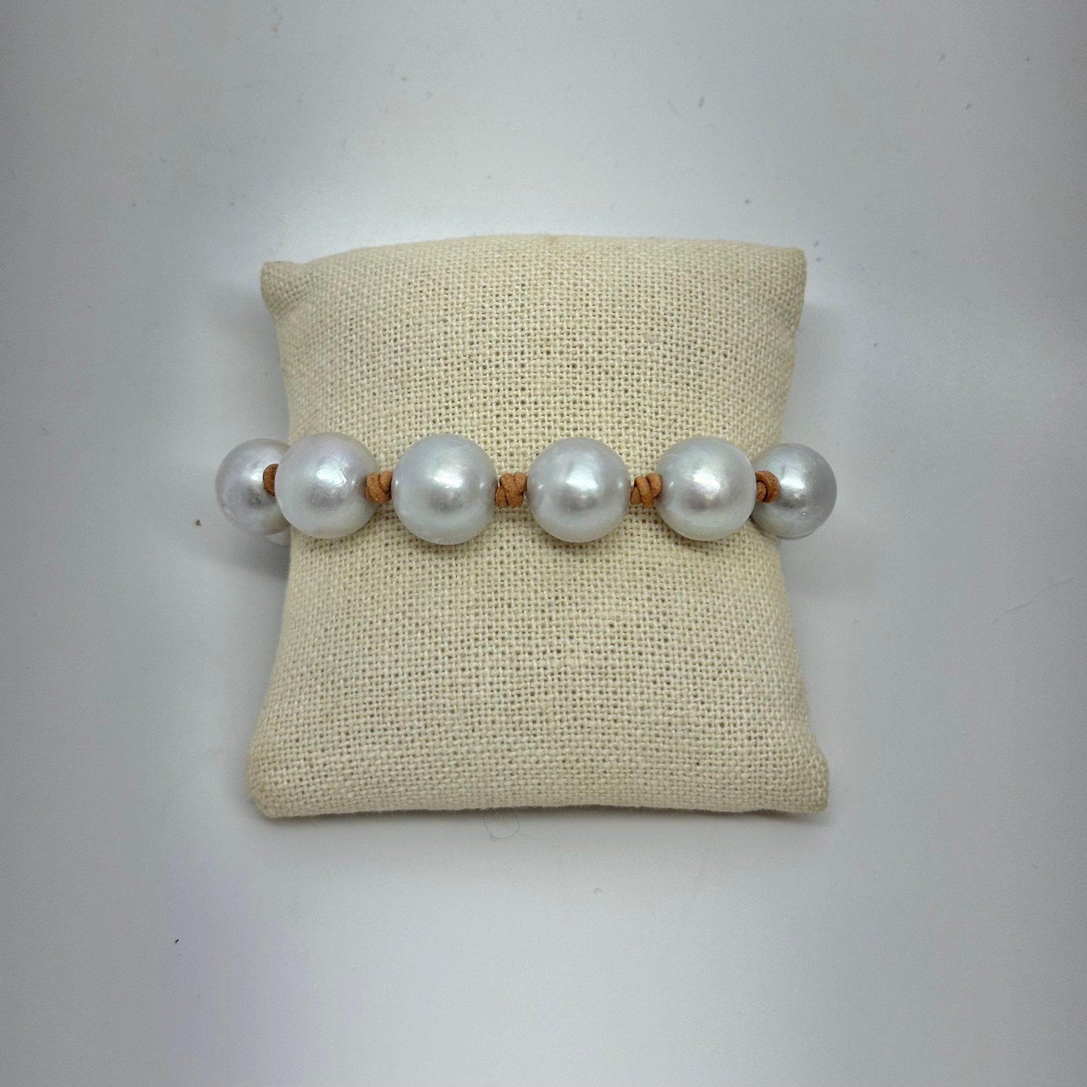 Beautiful Edison Pearls on leather with knots closed by a pearl going through a leather toggle.