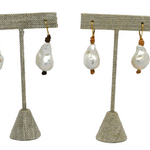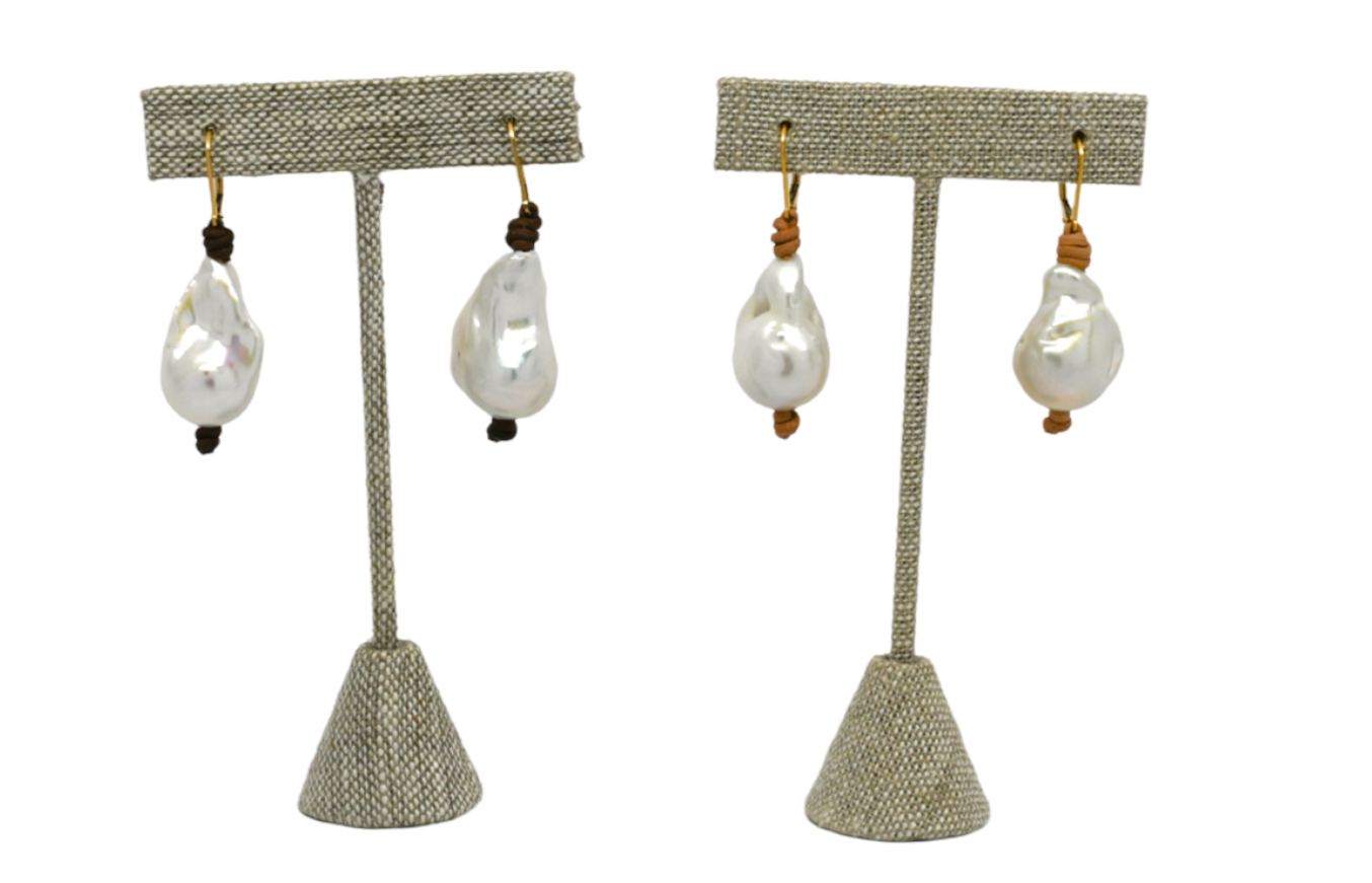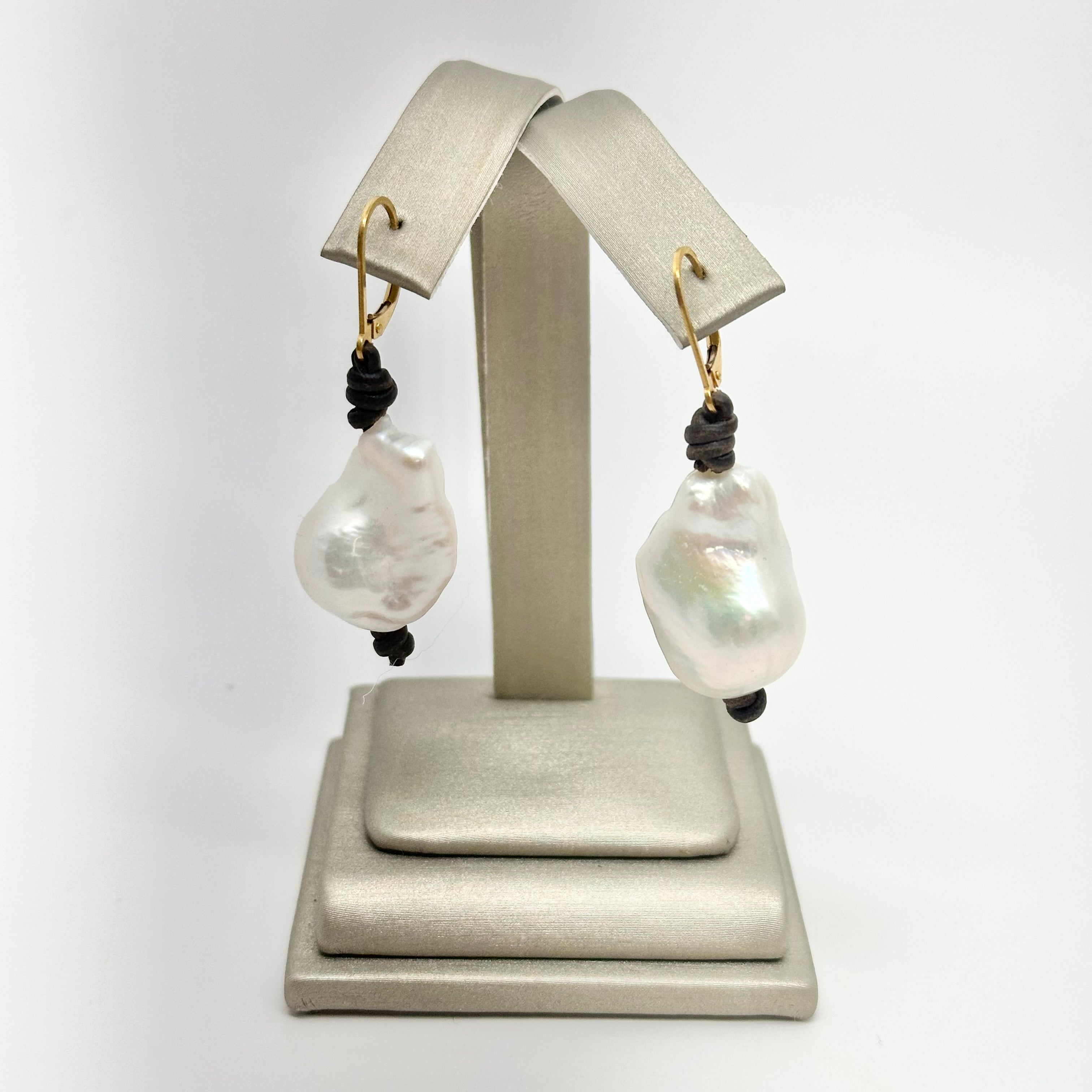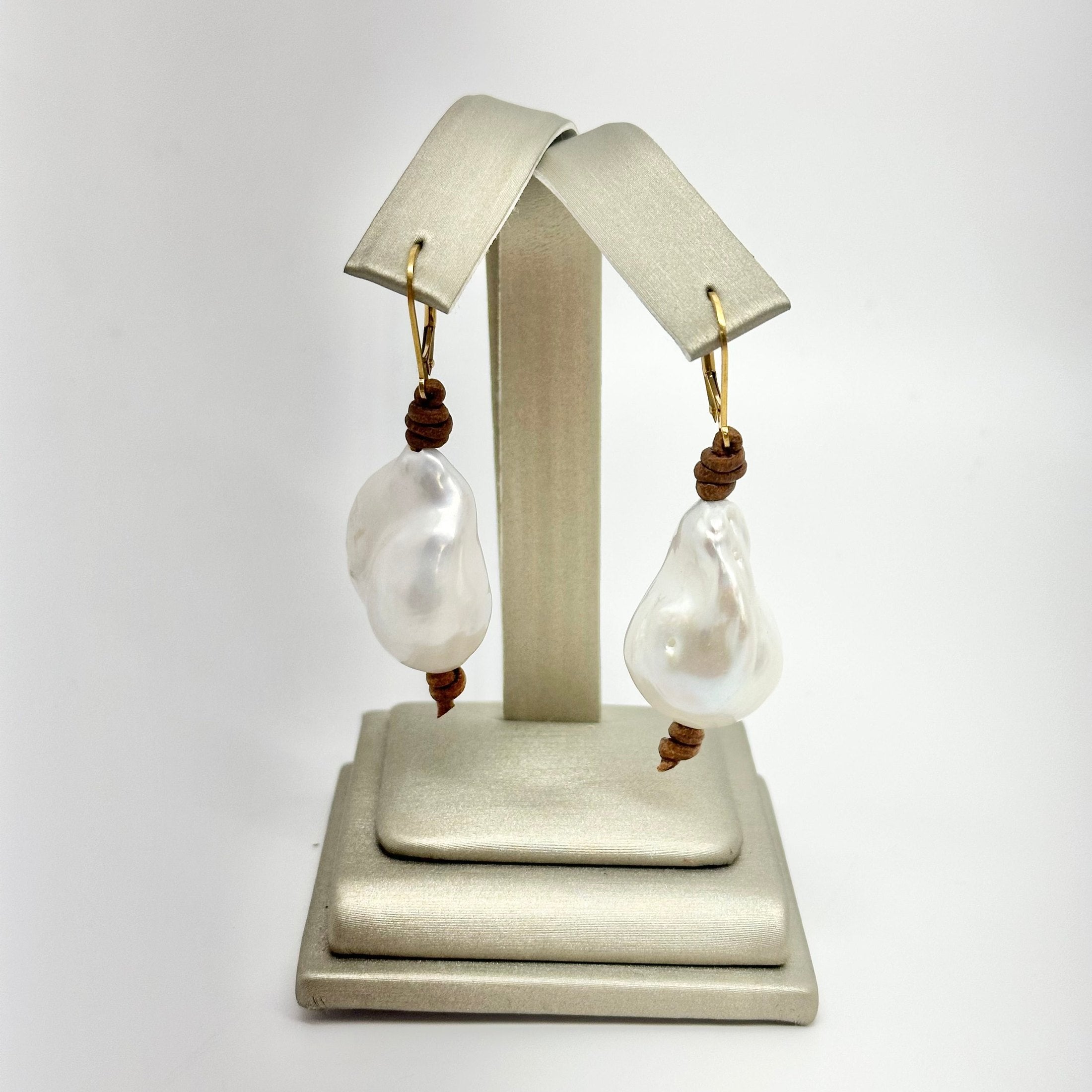 Large white baroque freshwater pearls on tan or dark brown leather - Gold plated earrings.