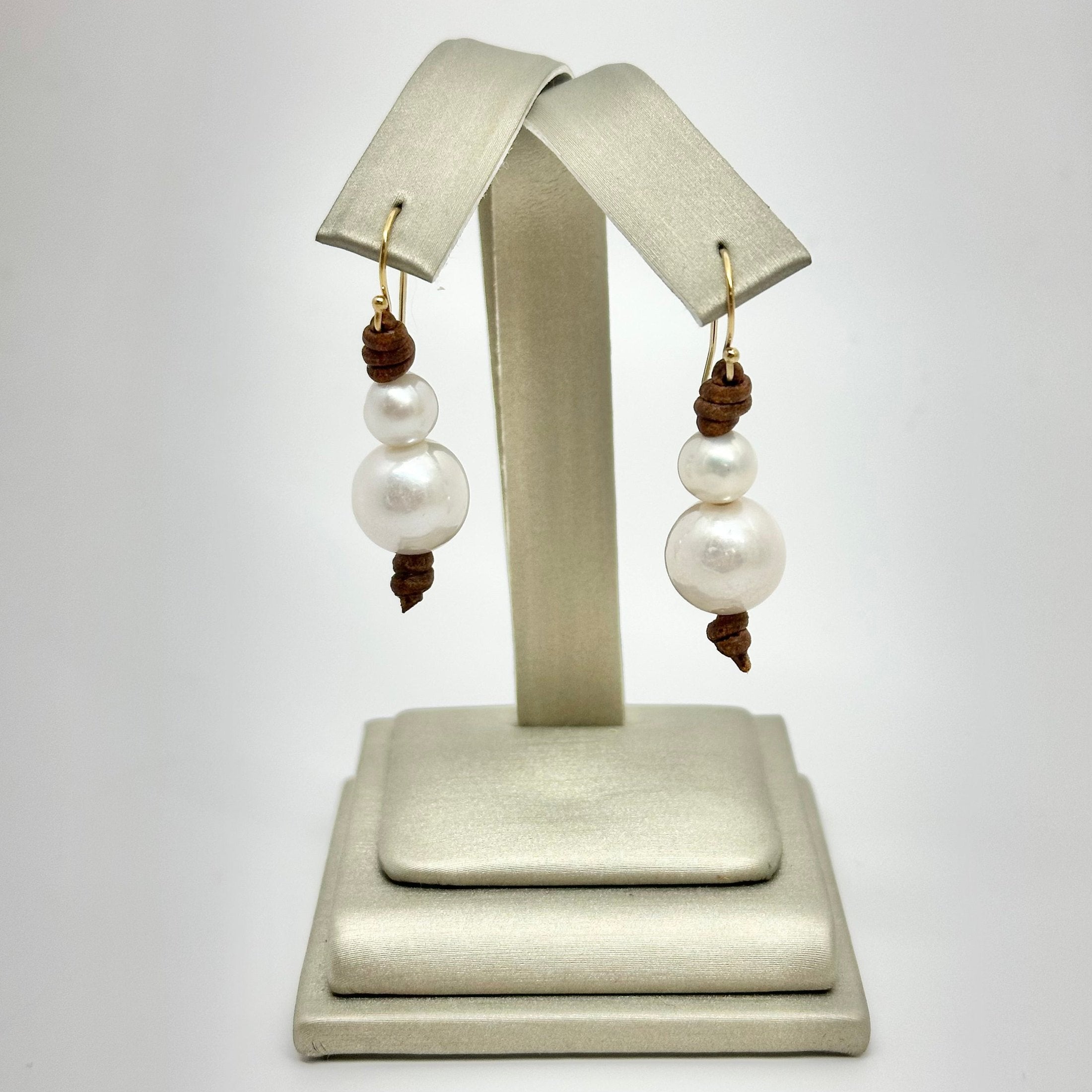 Round small and large freshwater pearl on dark or tan leather - gold plated earrings.