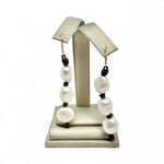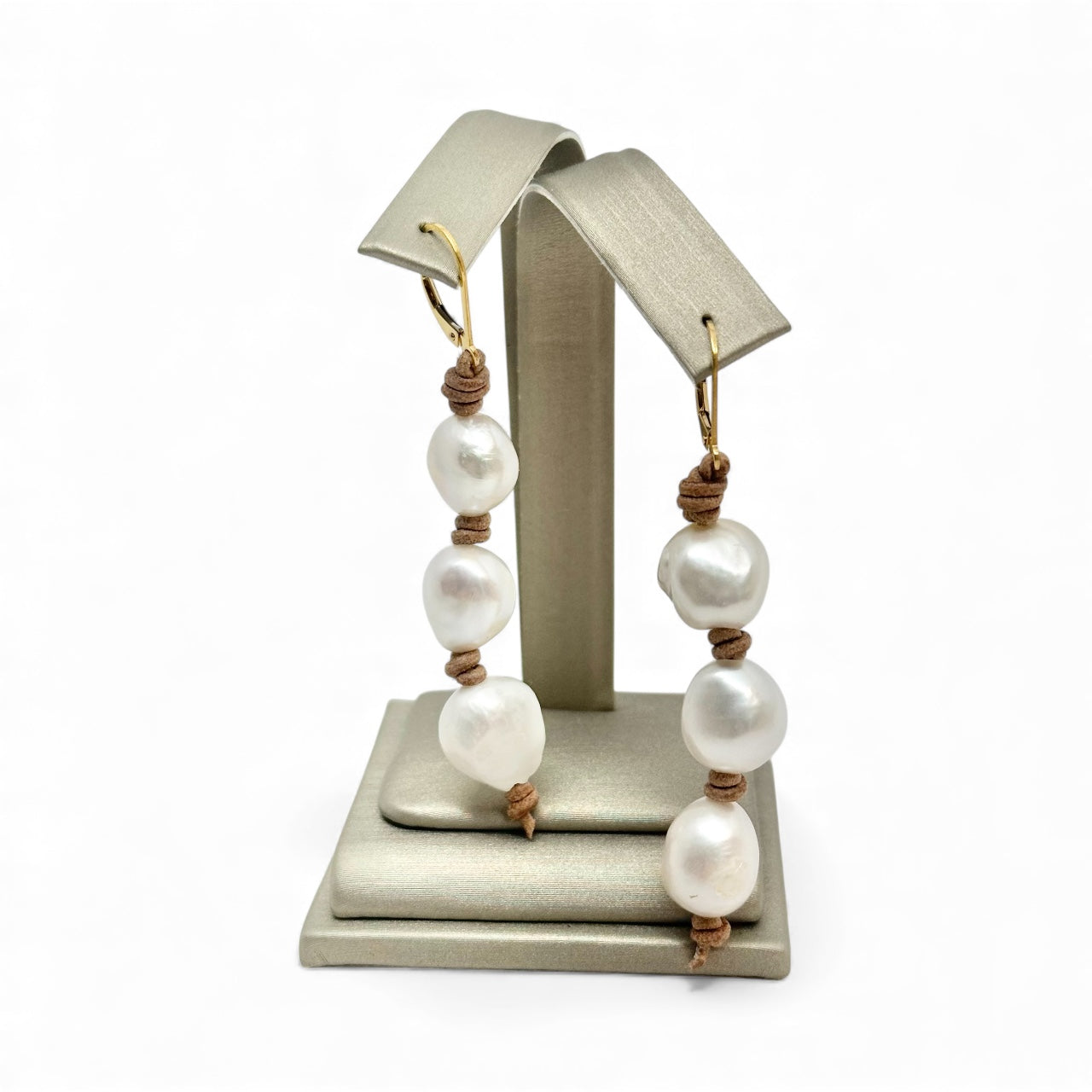 Three Freshwater Pearls strung on dark brown or tan leather. Complete with gold plated clasp. These earrings pair well with our Classic Lariat.