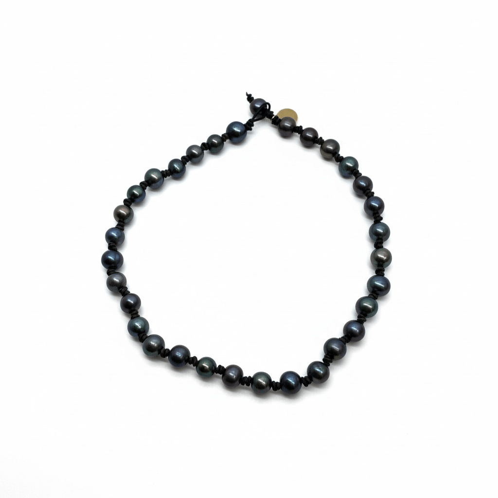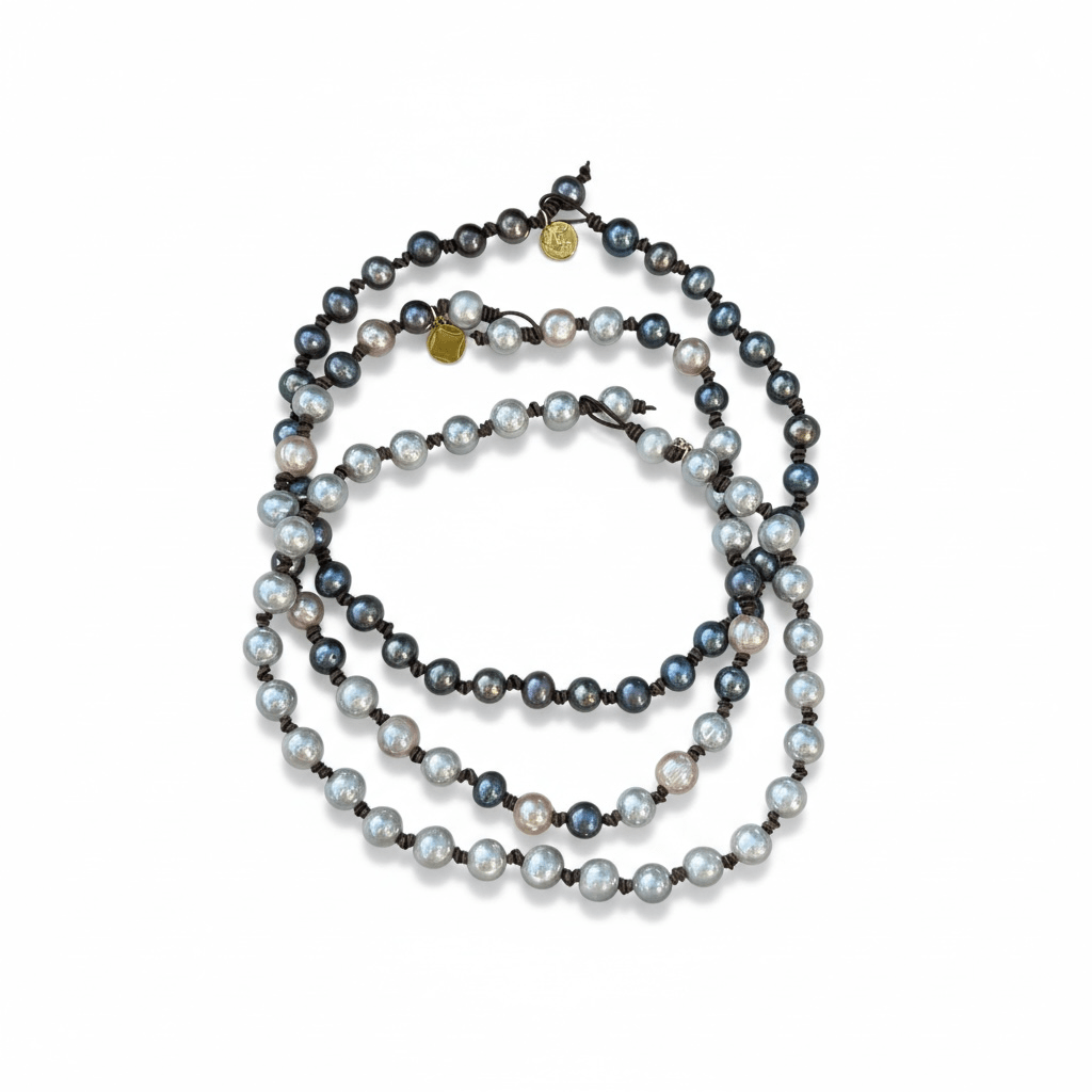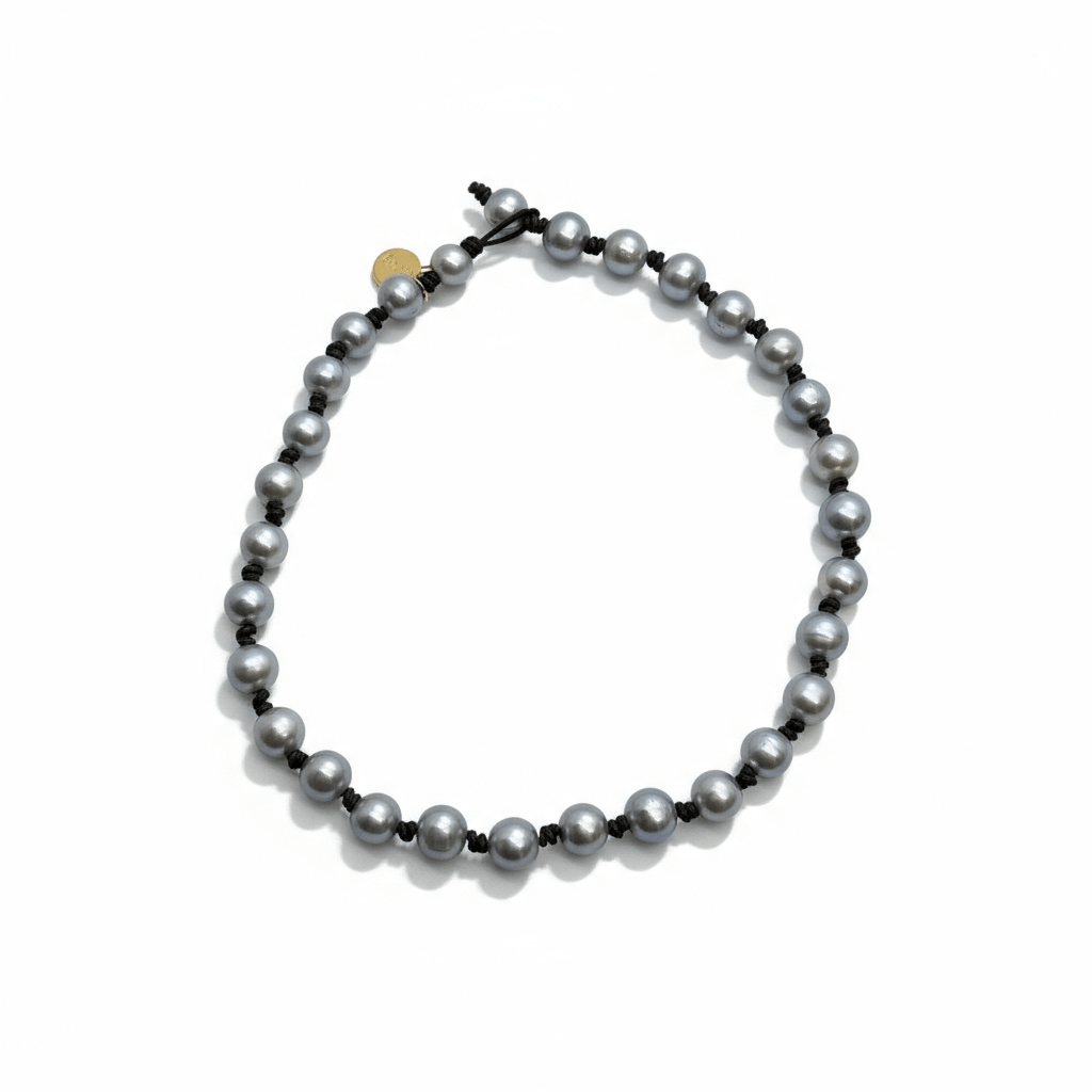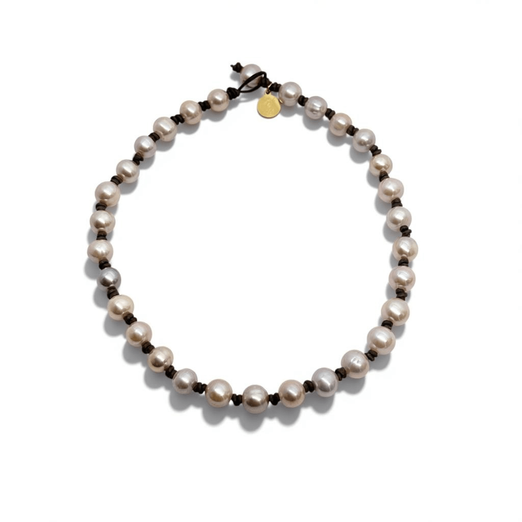 Delicate freshwater pearls meet supple dark brown leather in this refined choker, secured with an elegant knotted design and leather loop closure. A sophisticated piece that transitions effortlessly from day to evening wear.