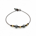 16.5” choker of dark brown leather with 2 Tahitian Pearls and 3 18K Gold rondels.