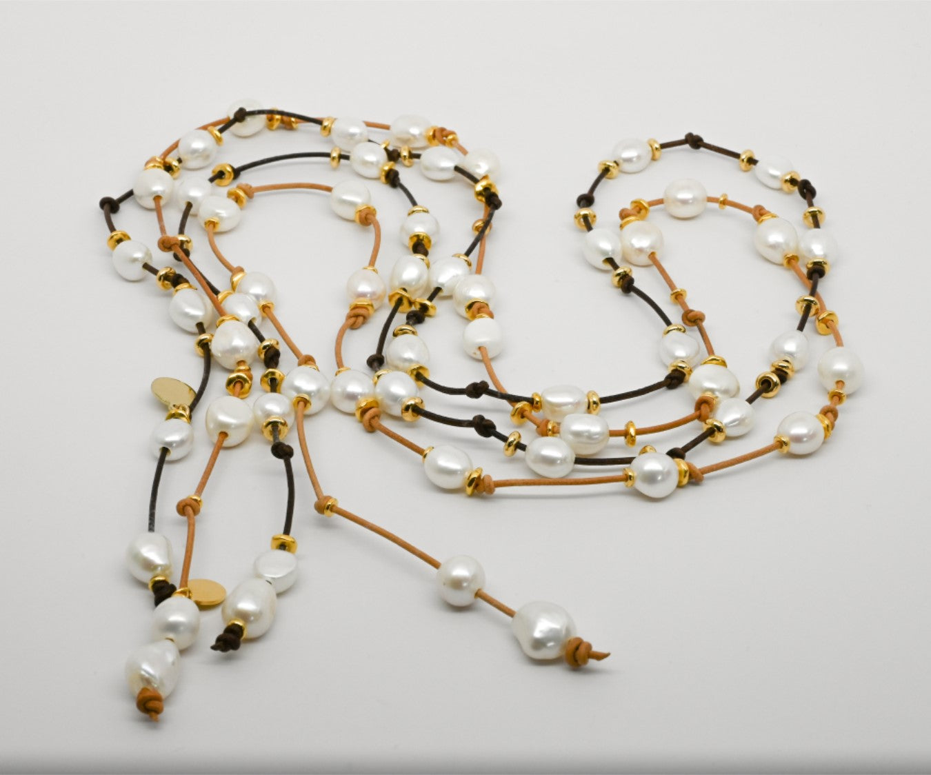 Our classic Lariat with a twist - Gold plated beads have been added to the pearls.