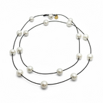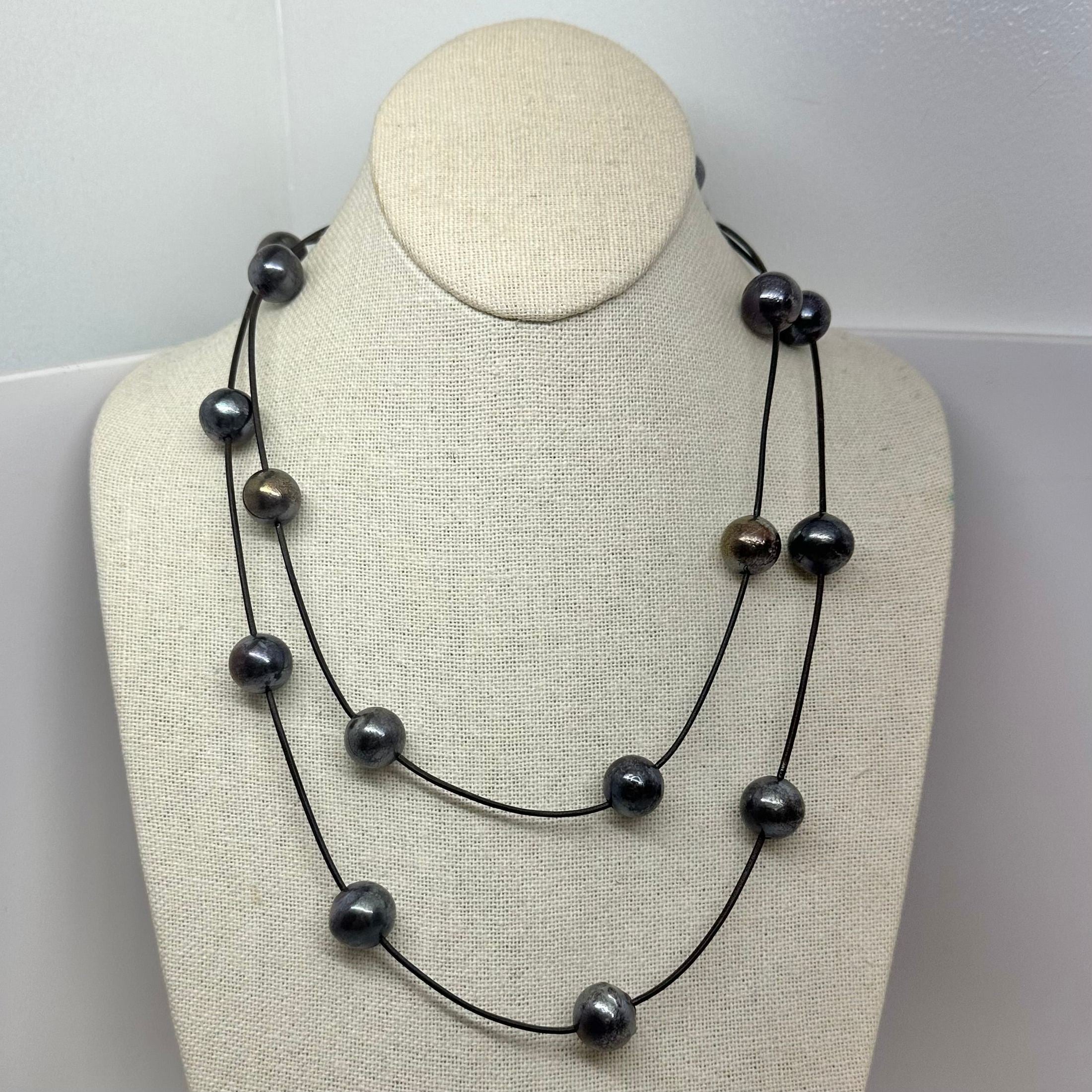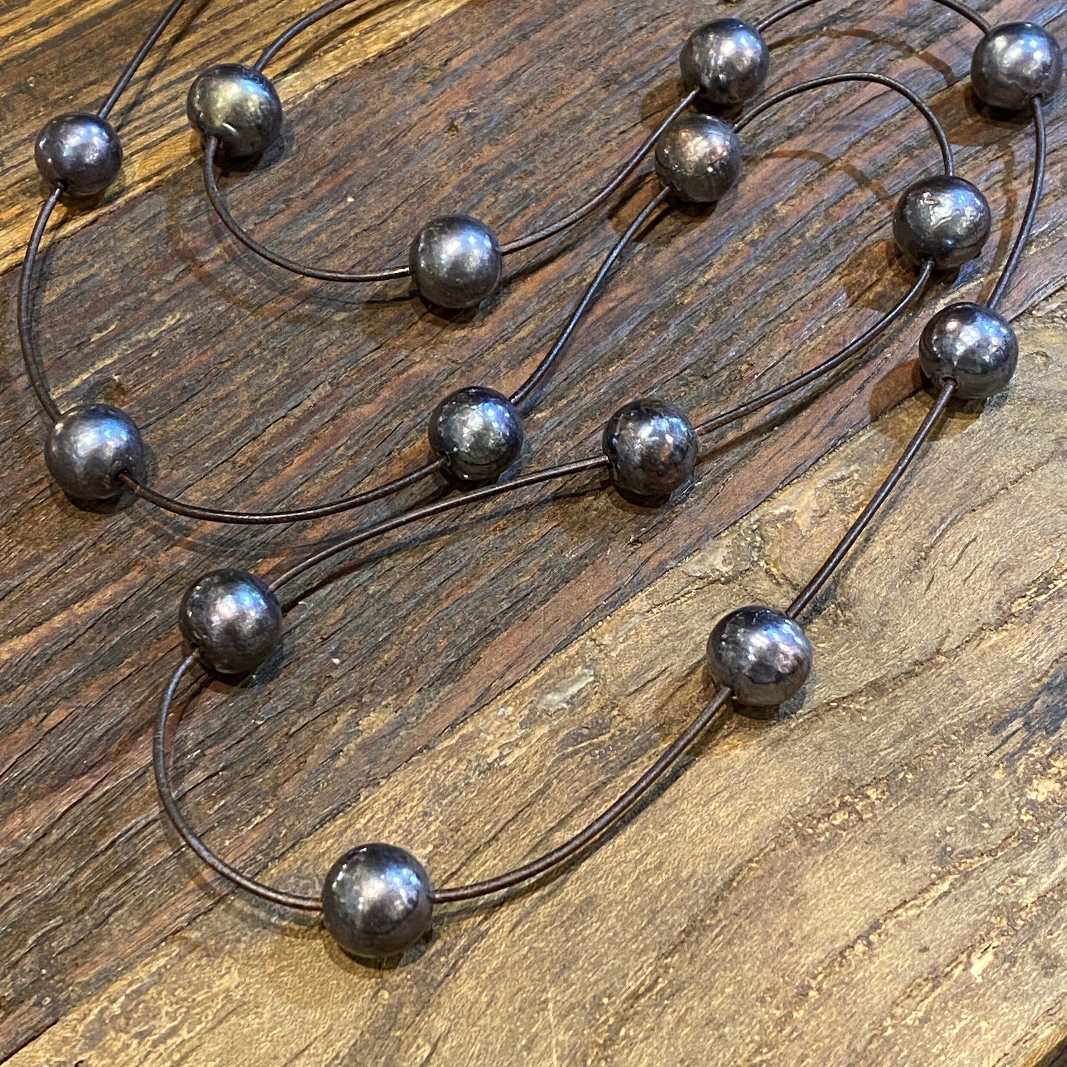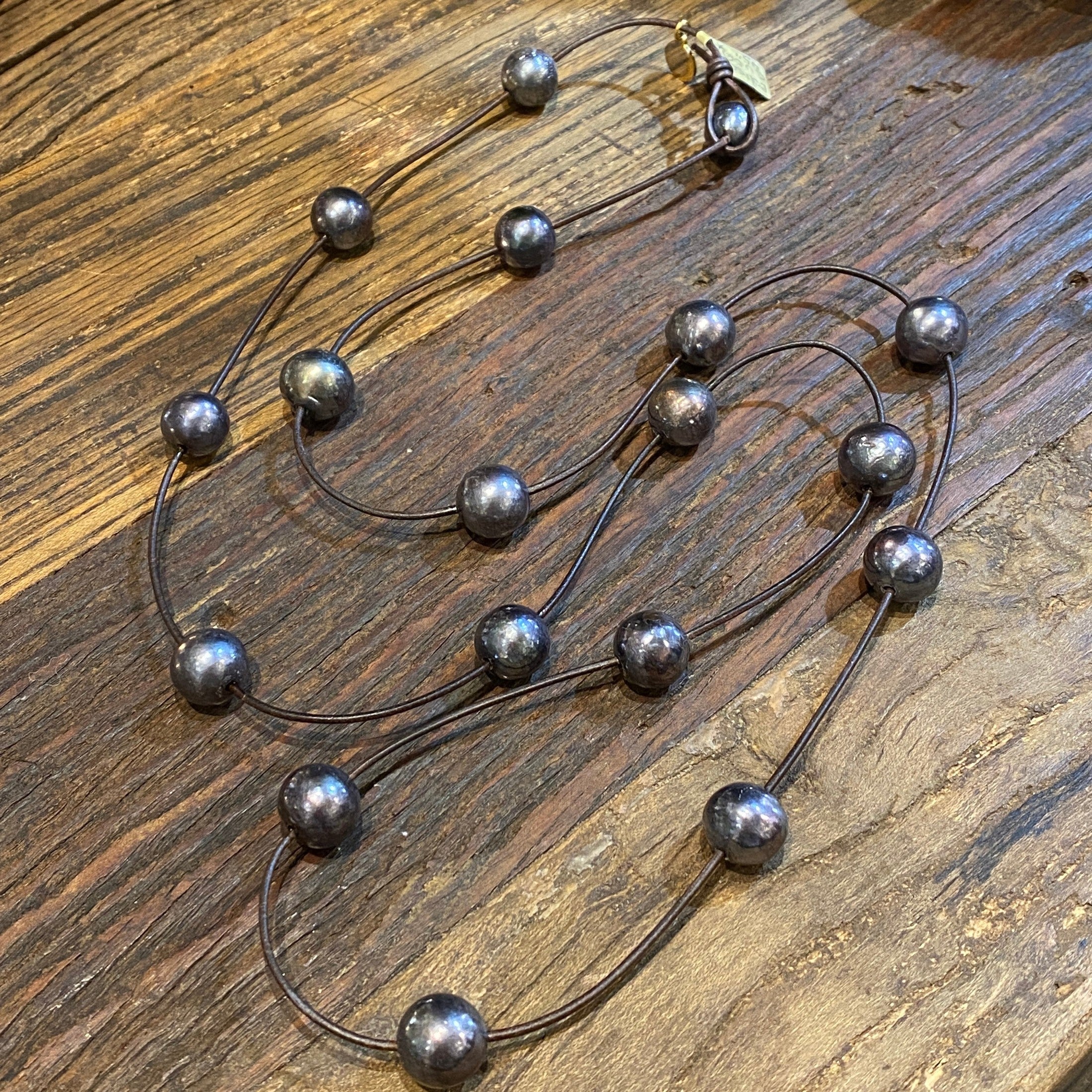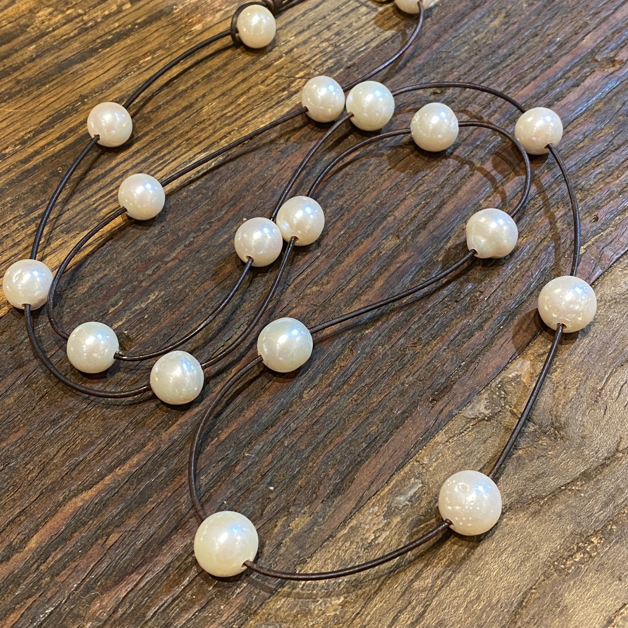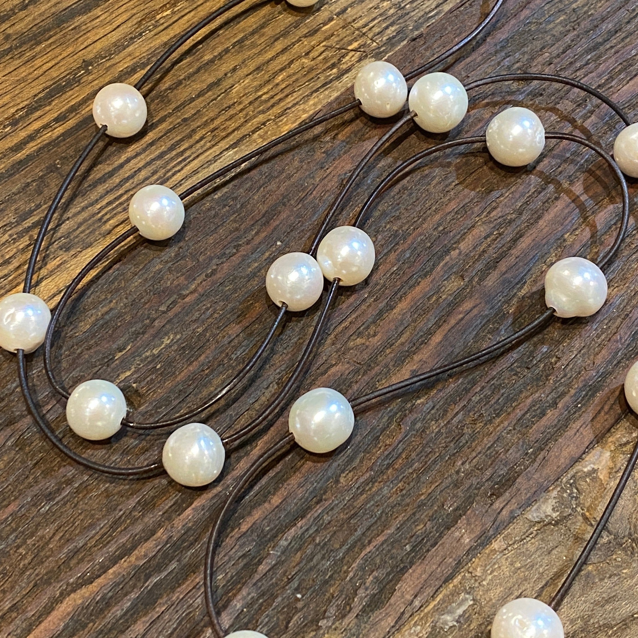 Large Edison Freshwater Pearls on leather, 45”. Can be worn shorter by pushing pearls through leather slip knot. Can be wrapped around 2/3 times.