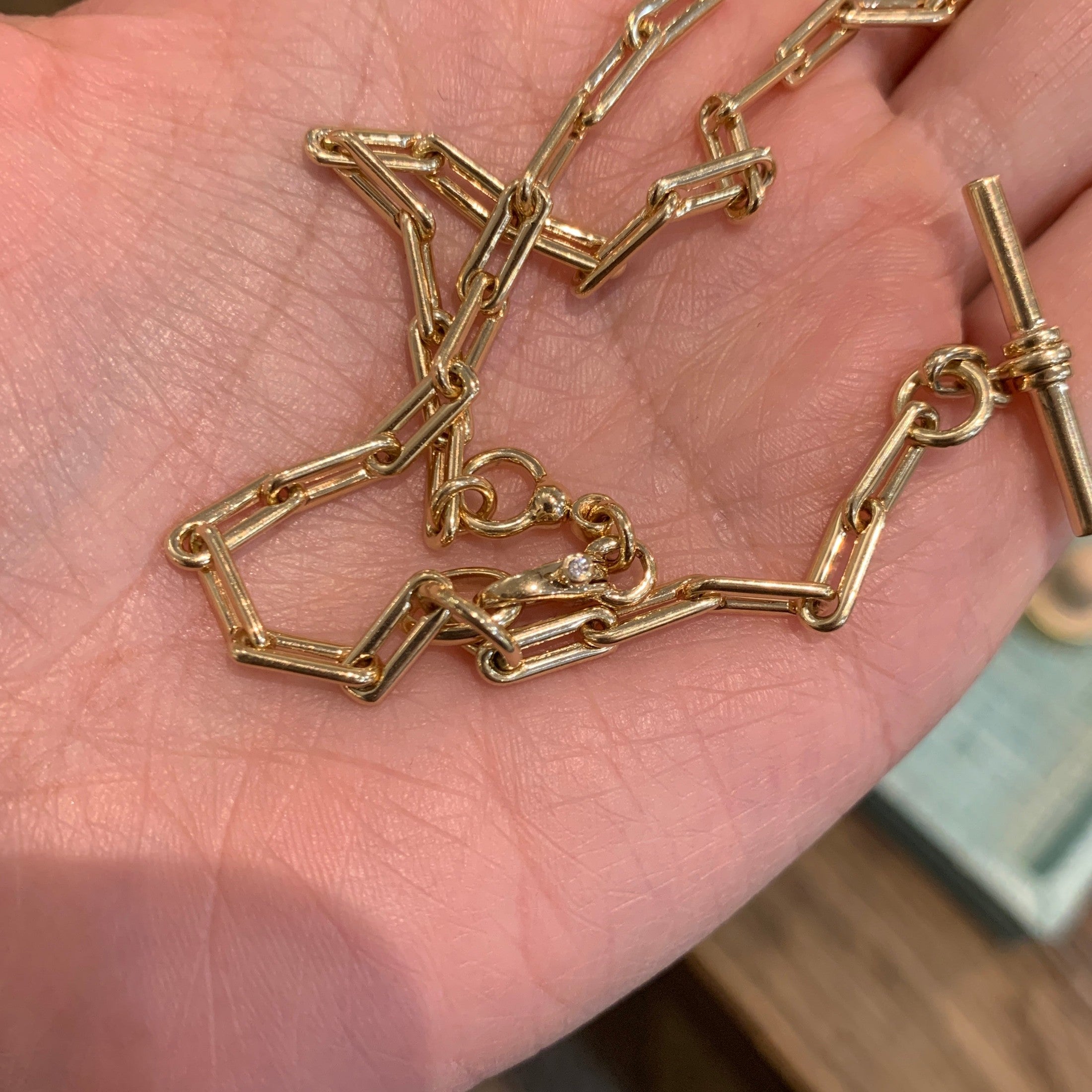 14K Yellow Gold Link Chain (can be worn 16.5" + 2 in extender); clasp has a petite white diamond.