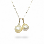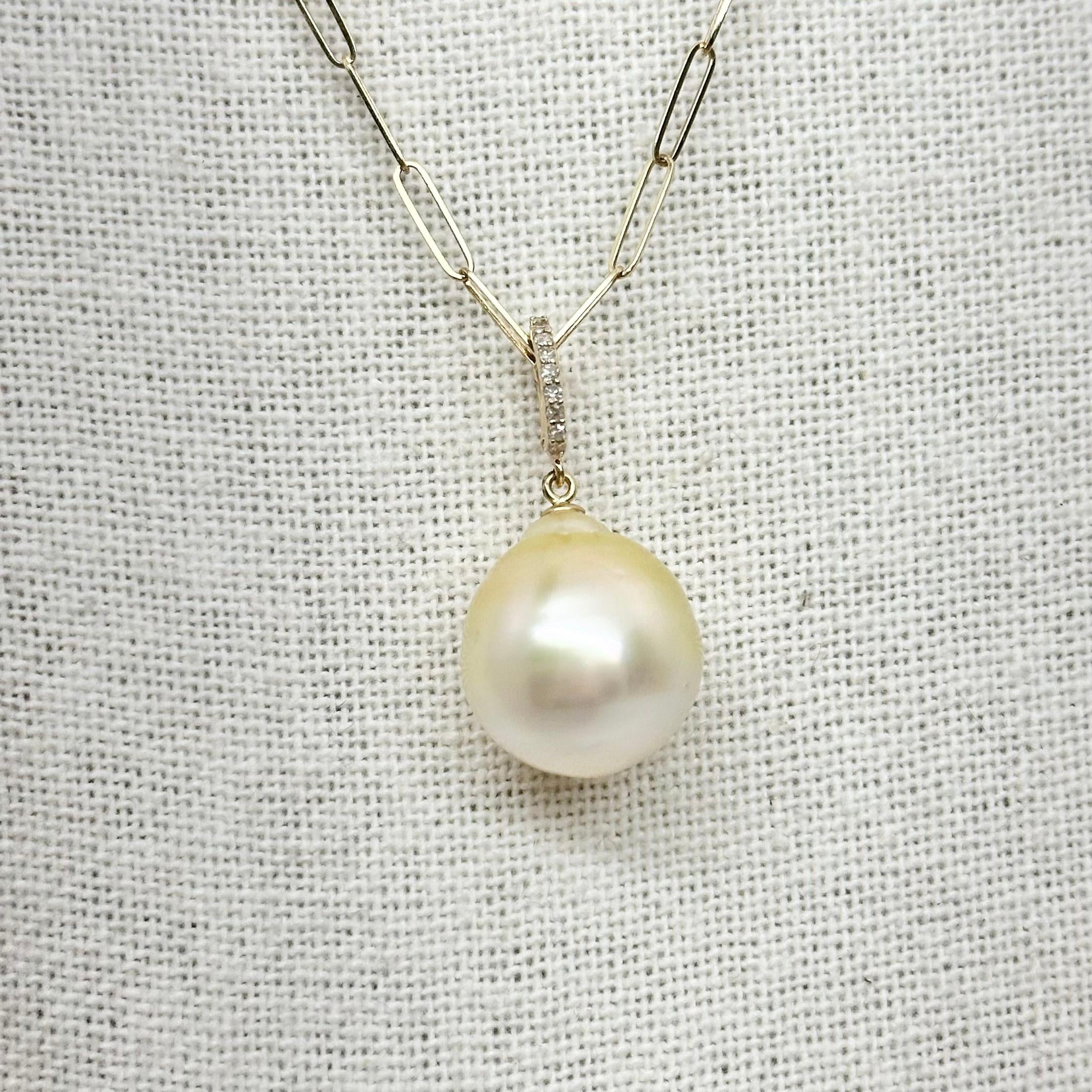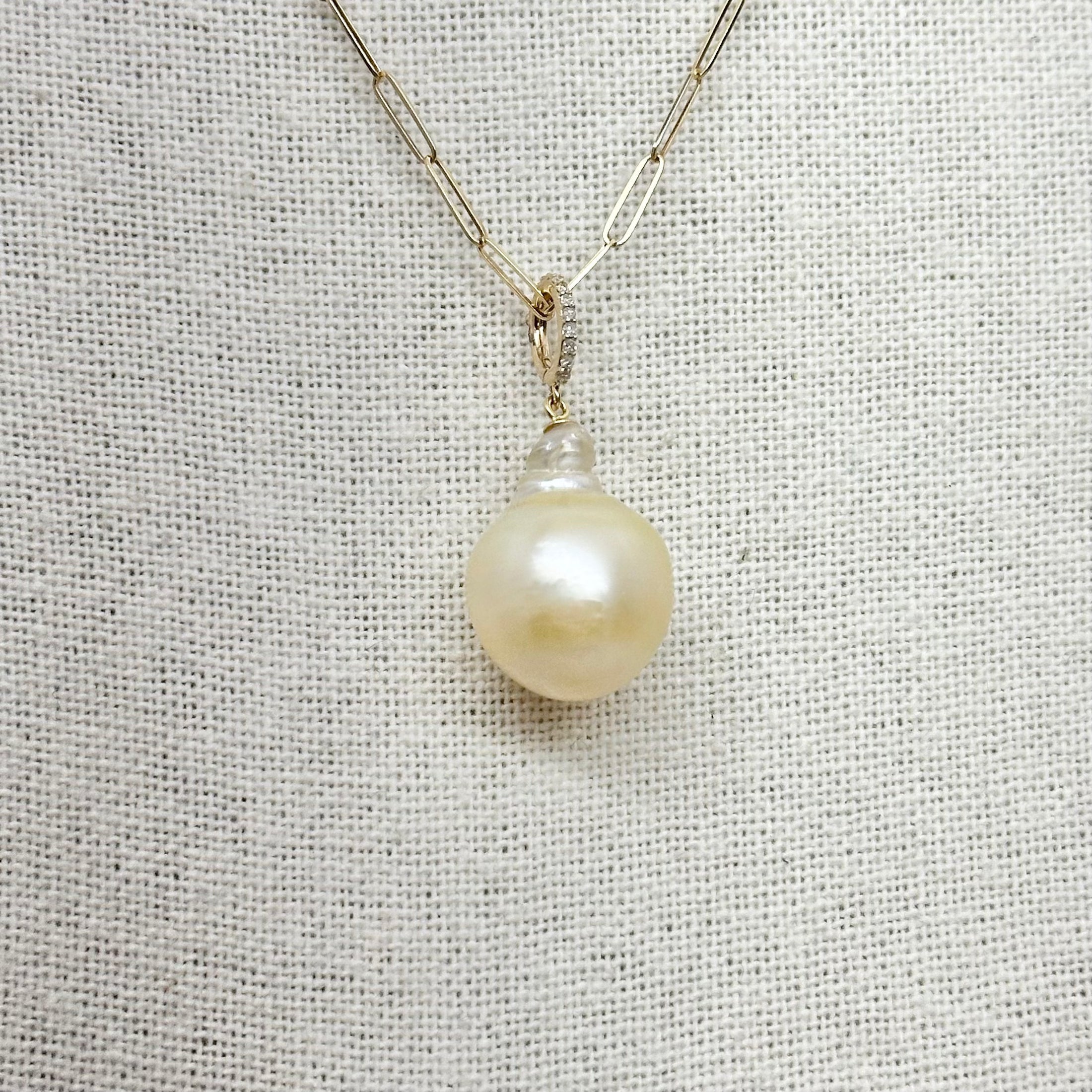 Large South Sea pearl enhancer. 14k gold clasp with pave diamonds. Can clip onto any necklace.