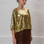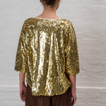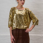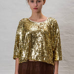 Sequined half sleeve scoop neck shirt.