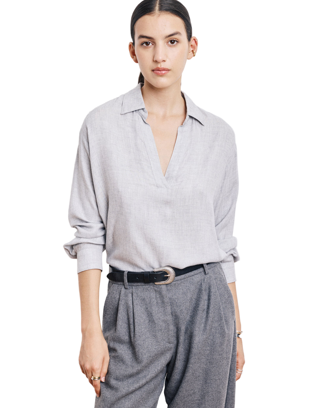 - Loose, flowing blouse in mottled gray viscose and wool