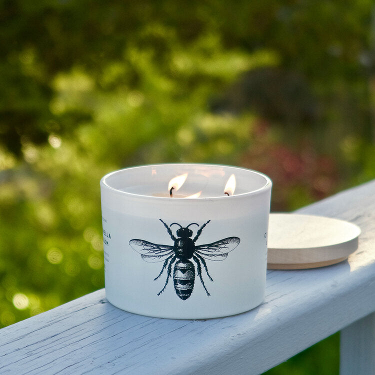 Citronella is a proven, all-natural, insect repellent made from the leaves and stems of the lemongrass plant. It repels insects by masking the smells biting insects are attracted to. Our citronella oils are blended with fine fragrances to smell as good as they look. Once lit, the only bugs you’ll see are the graphic ones silk-screened on these handsome candles.