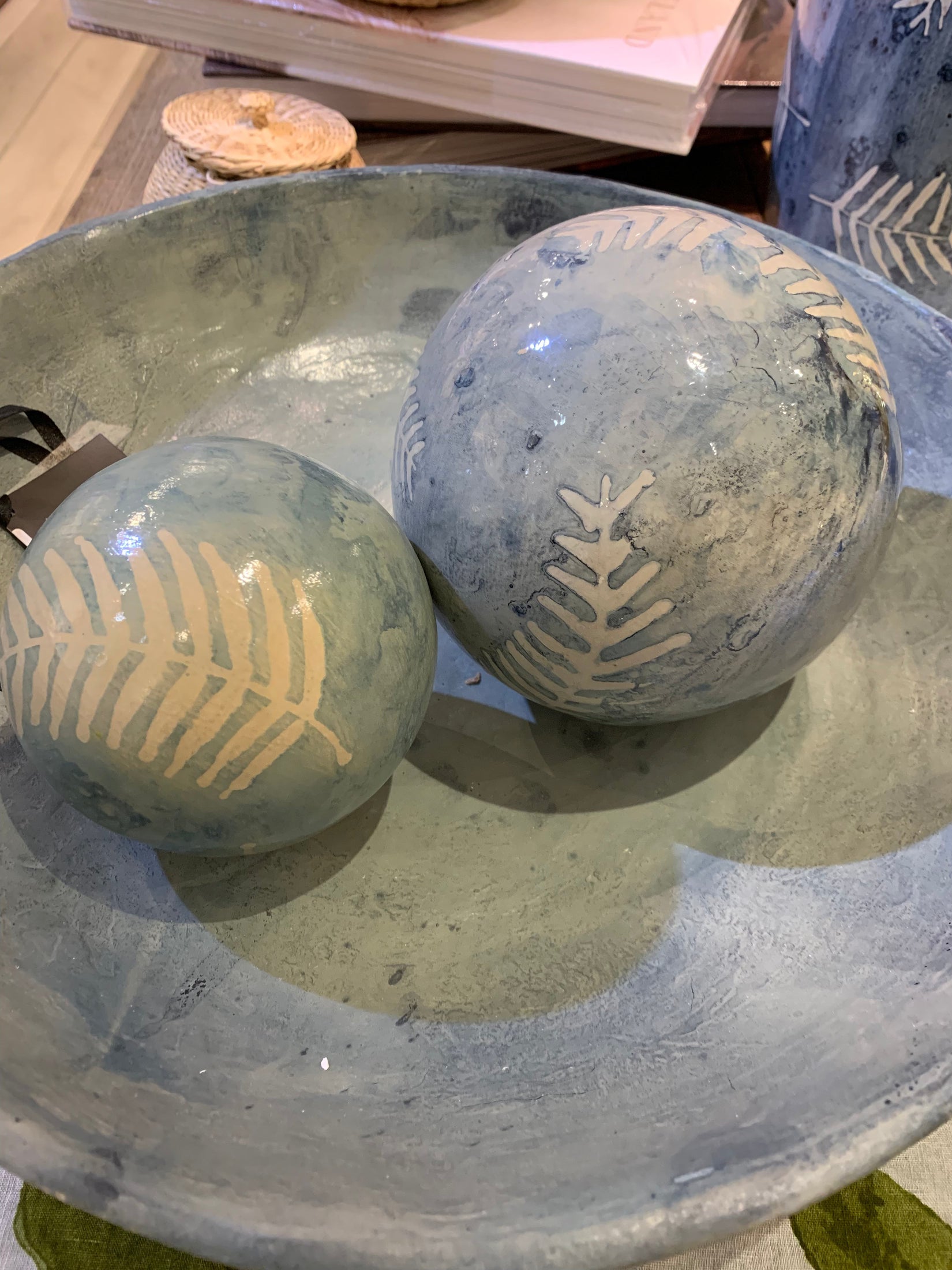 Made of a composite natural eco mix, then painted with lacquer, this decorative orb has an artisan look. Each wispy fern is painted by hand making each and every piece a work of art. A beautiful accent for side table, bookshelf or console.