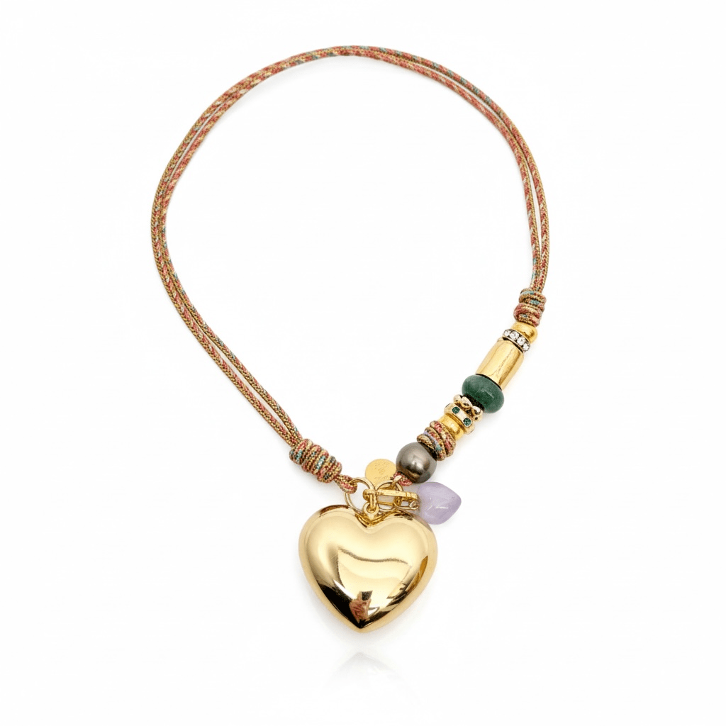 Puffy Heart Charm with Accents on Green Metallic Chord | 17"