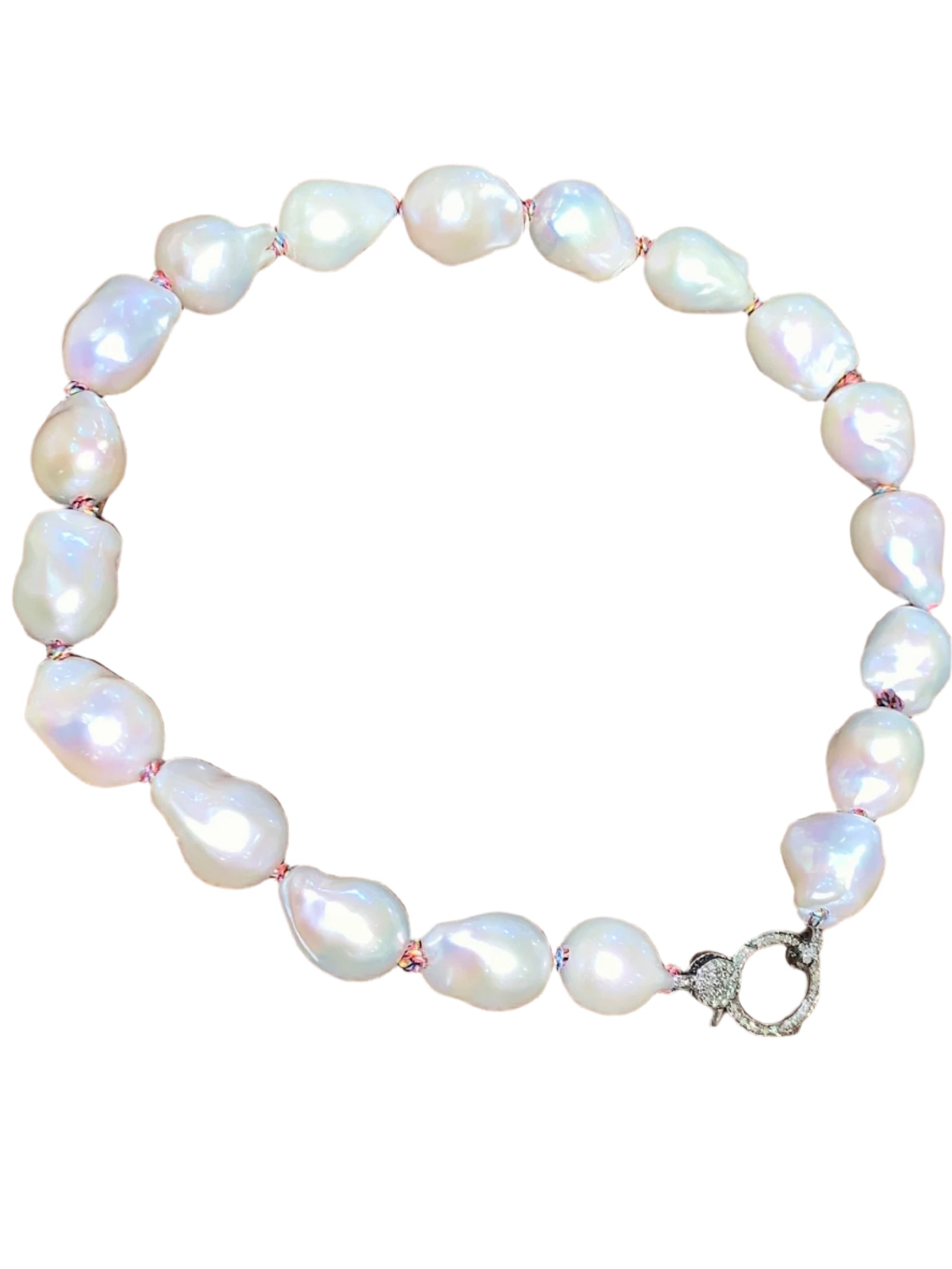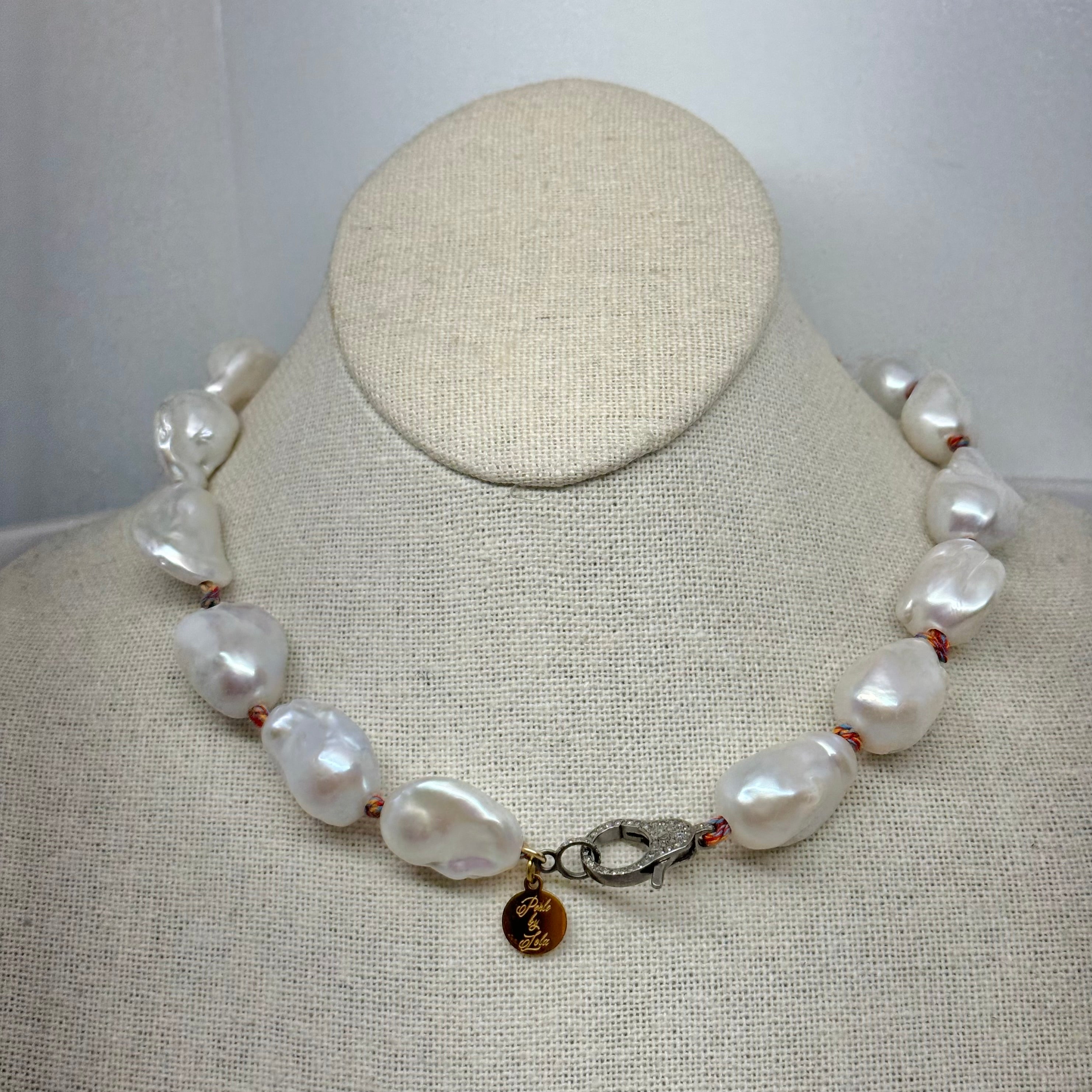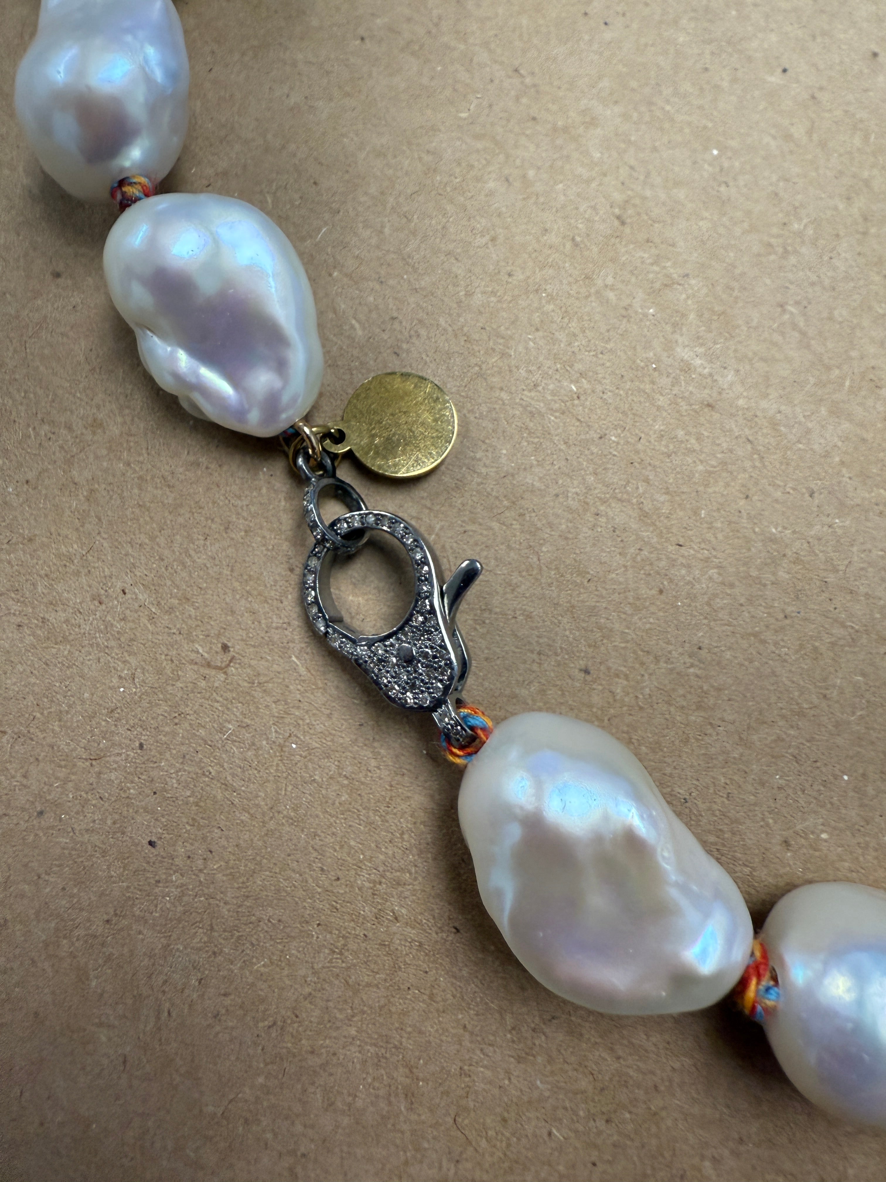 17" Choker with medium sized Baroque Freshwater Pearls with Silver Pave Diamond clasp & loop on multi-color thread/cord.