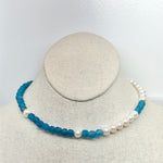 This 16" choker features delicate freshwater pearls and vibrant blue glass beads elegantly threaded on leather. It offers a refined touch of color, perfect for wearing solo or layering for a stylish, sophisticated look.