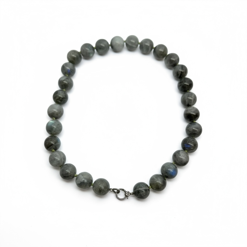 Labradorite semi-precious beads strung on silk with silver pave diamond lobster clasp. Clasp can be worn in front or back. Charms and pendants can be attached to clasp to enhance necklace.