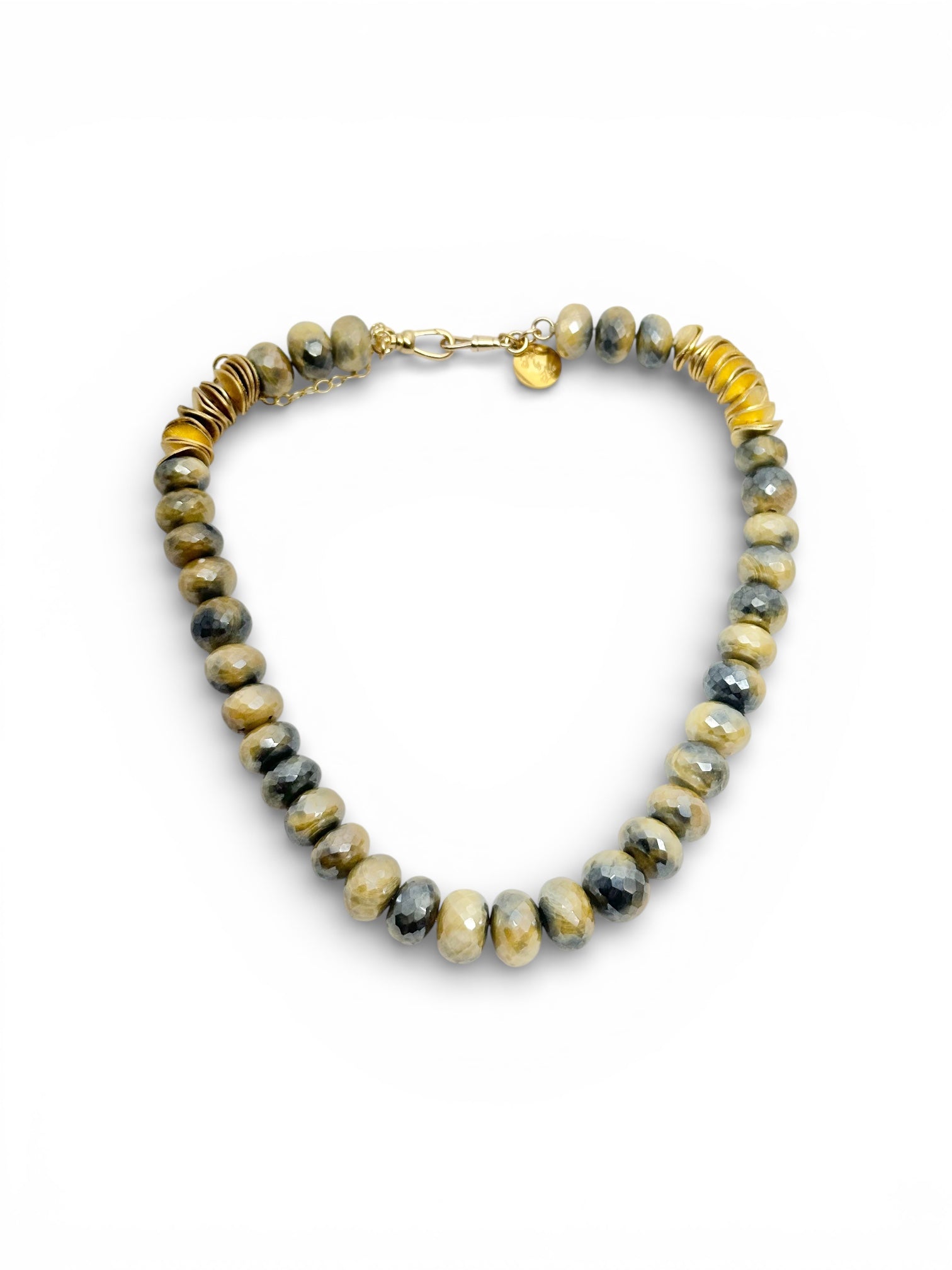 Delicate moonstone beads paired with lustrous gold accents, strung on fine silk for an elegant, close-fitting necklace. This 15" choker captures ethereal light with each movement, offering a refined touch to any ensemble.