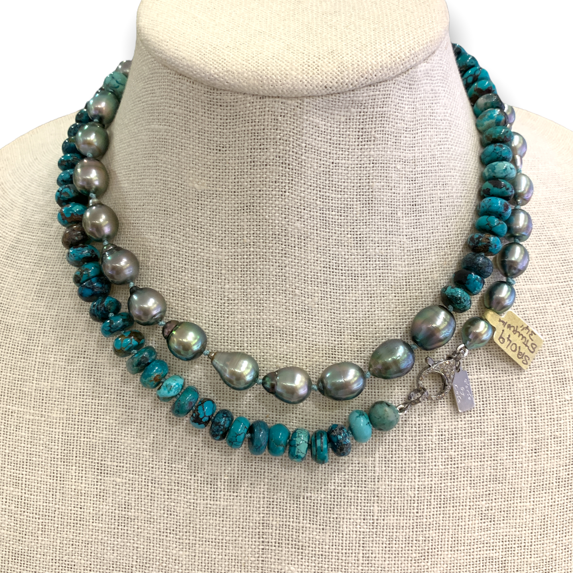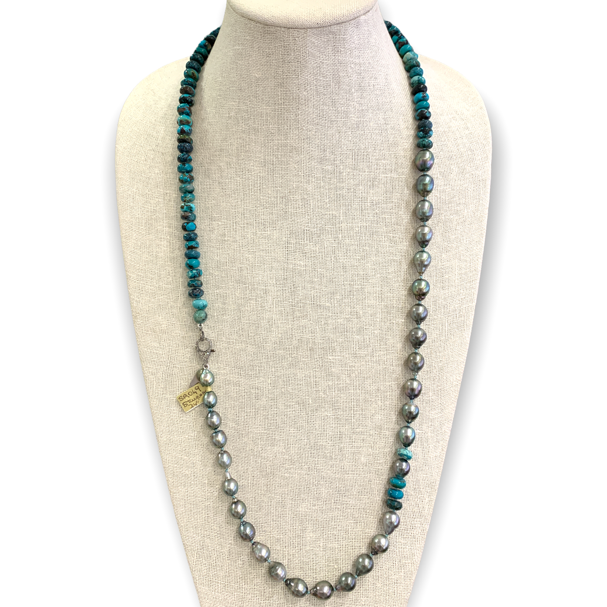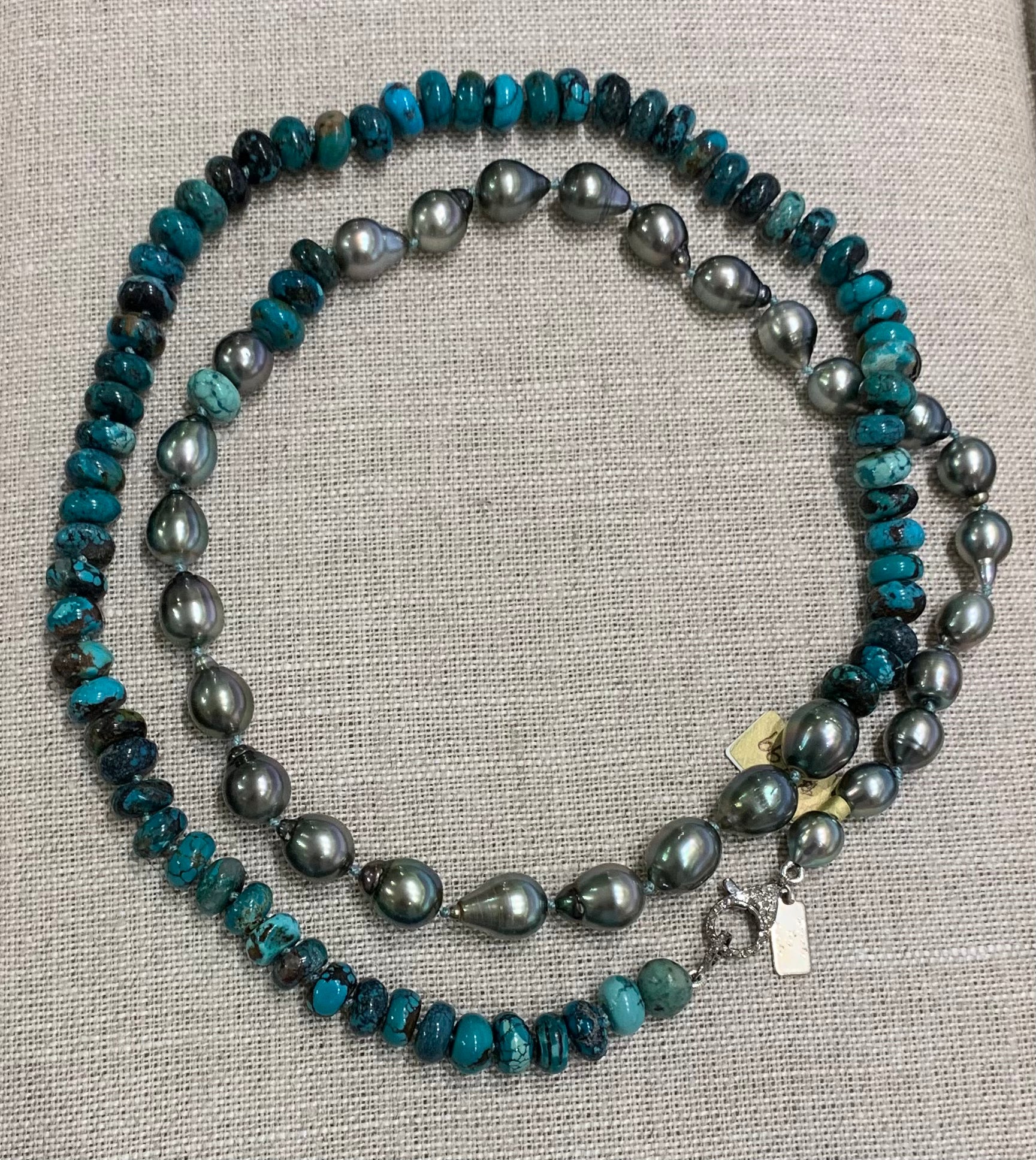 34” Necklace with Tahitians Pearls & Turquoise on Silk with Silver Pave Diamond Clasp.