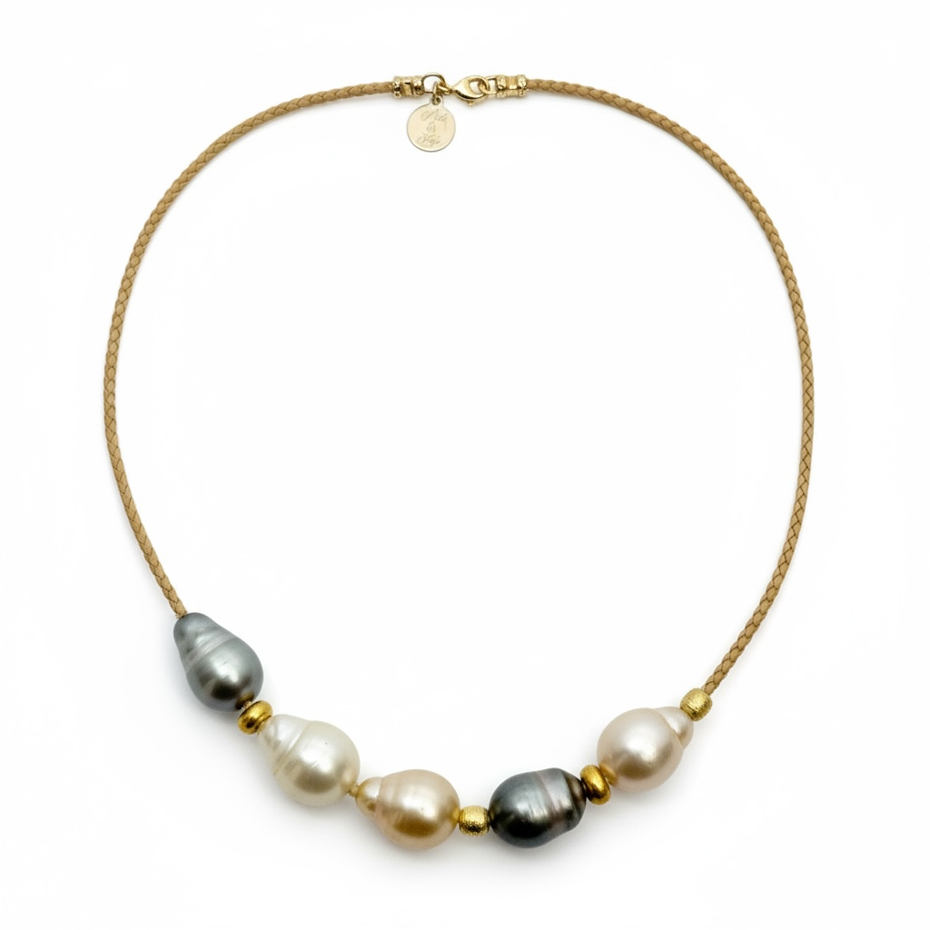 Combining lustrous South Sea and Tahitian pearls with polished 18K gold roundels, this necklace features a refined tan braided leather strand. An elegant choice for layering, it brings understated luxury to any ensemble.