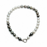 Tahitian and south sea pearls strung on dark brown leather with large silver pave diamond clasp.