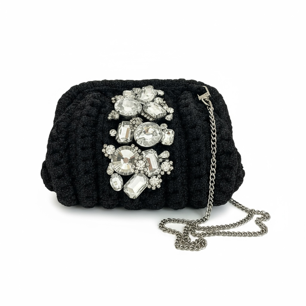 Micro doctor bag. Delicate embellishment with rhinestones covered by lace. Jewels chain. Black combo.