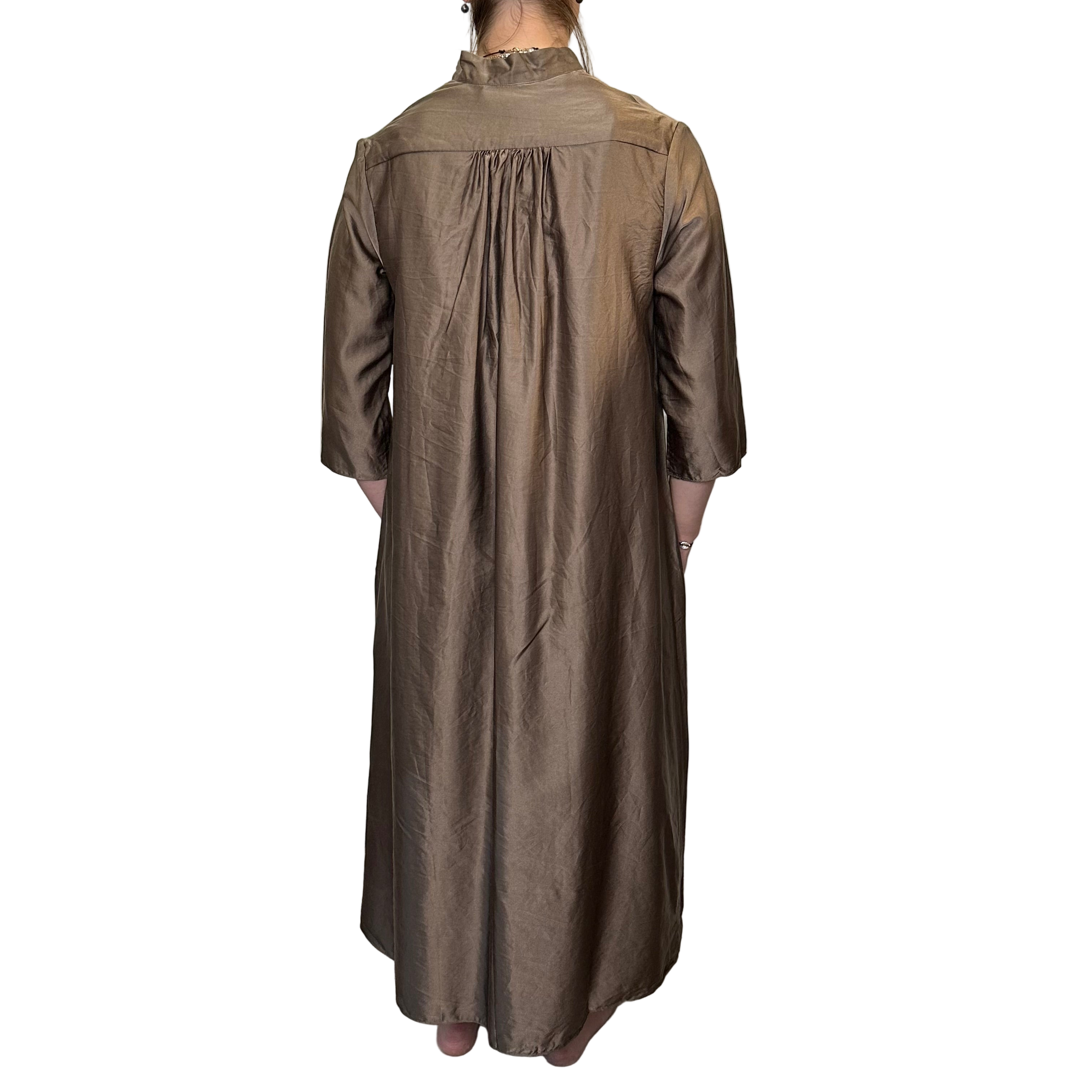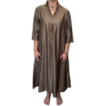 Easy to wear calf length dress with 3/4 length sleeves. hand sewn tab on the front opening and 2 side seam pockets, making it even more practical. easy to wear loose fitting silk dress, the cotton and silk mix makes the dress more durable while keeping its satiny shine.