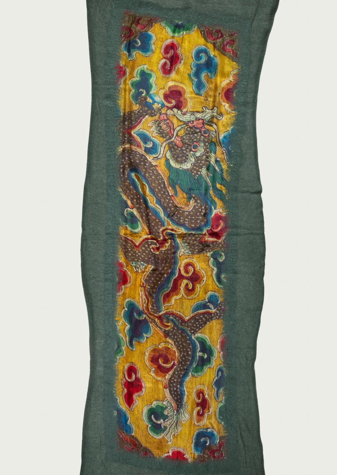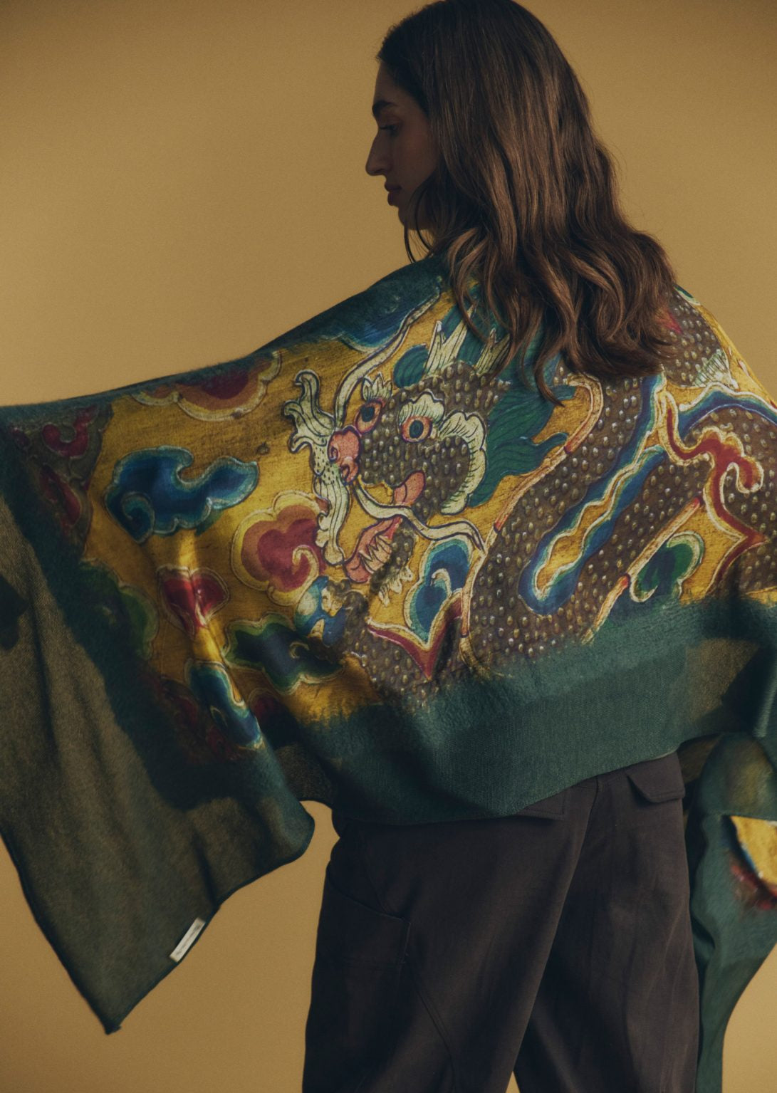 Delicately knitted superfine cashmere shawl fused with a printed silk shawl and enhanced with a hand-felted finish. The exquisite quality of this unique piece is achieved by the skilled hands of many Nepali women who are passionate about their work. Our inspiration comes from the chests used to store valuable and spiritual items in Tibetan homes. The images feature Buddhist protectors, Naga spirits and traditional motifs.