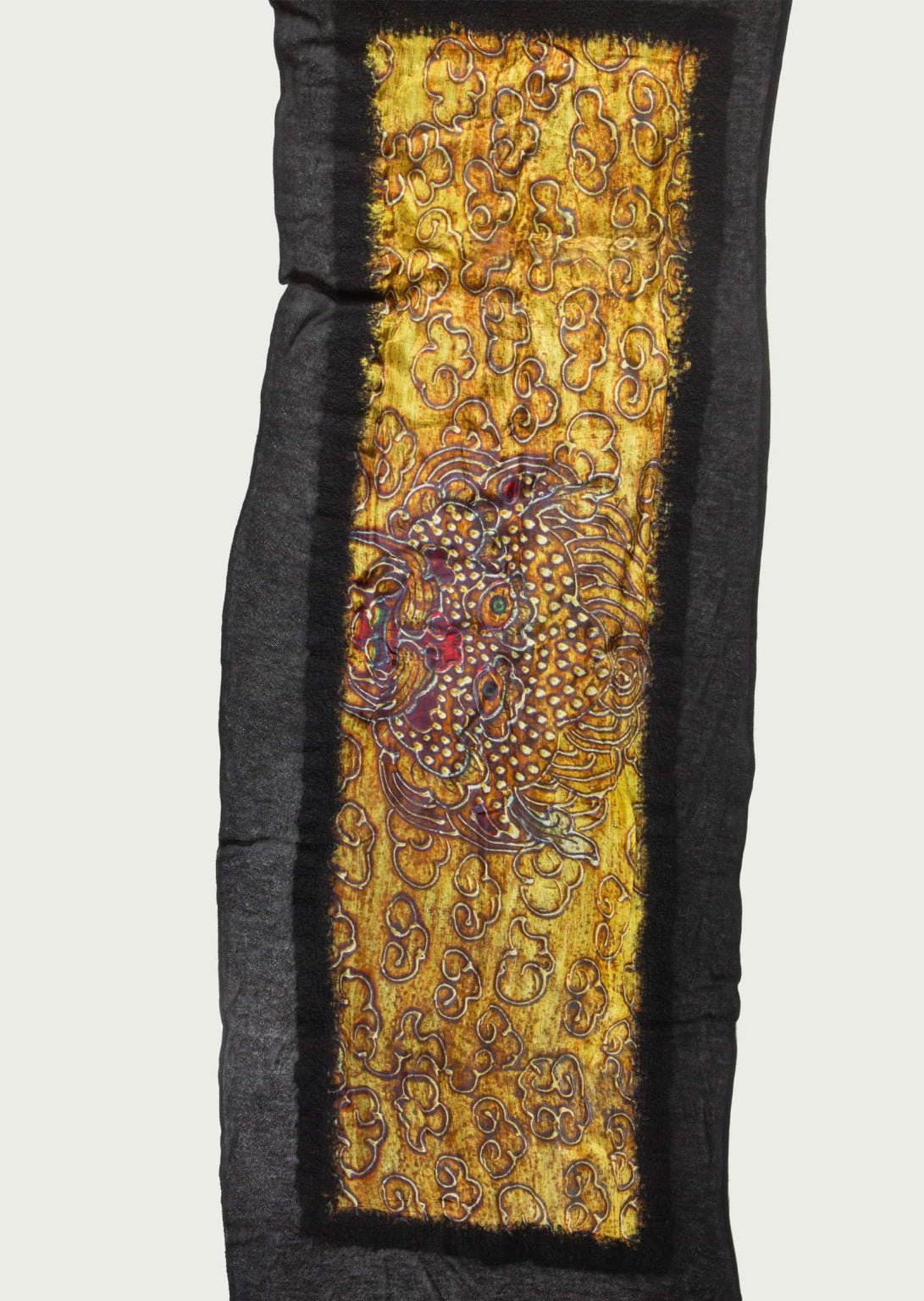 Delicately knitted superfine cashmere shawl fused with a printed silk shawl and enhanced with a hand-felted finish. The exquisite quality of this unique piece is achieved by the skilled hands of many Nepali women who are passionate about their work. Our inspiration comes from the chests used to store valuable and spiritual items in Tibetan homes. The images feature Buddhist protectors, Naga spirits and traditional motifs.