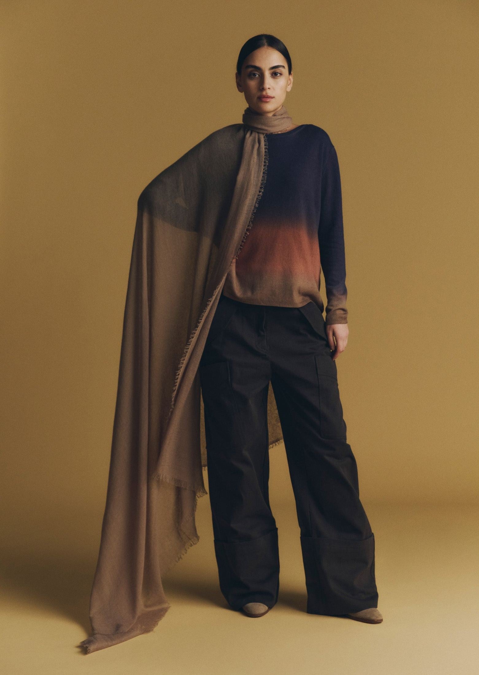 The large volume Soho is an open-weave hand-massaged pure baby cashmere shawl with a relaxed, casual look. Its open fringes soften the edges to give it a stylish yet versatile quality that also compliments more formal outfits, making it an absolute must for any wardrobe. Treated with our unique patinaed finish that adds depth to the colour and enhances the softness of the yarn.