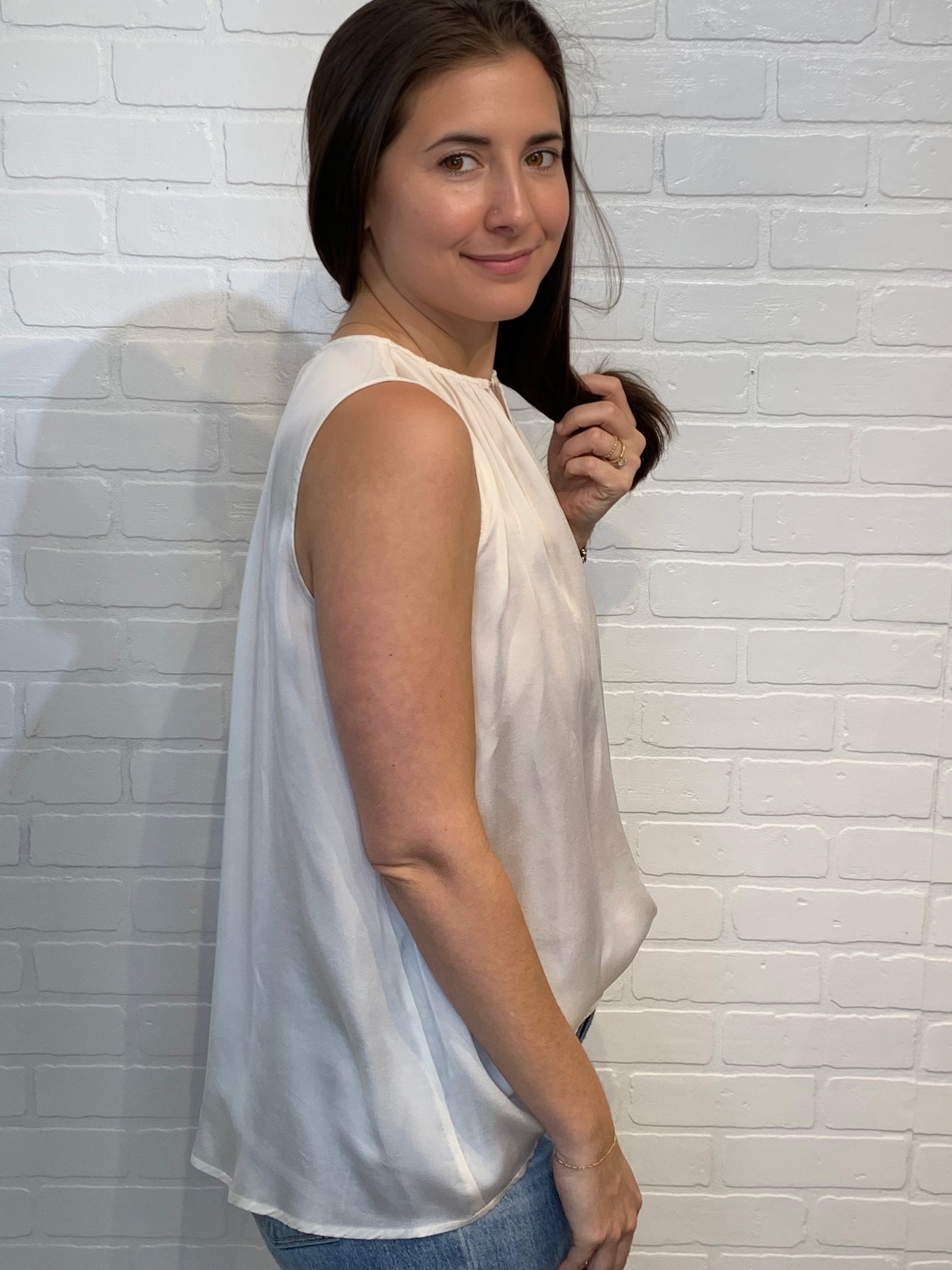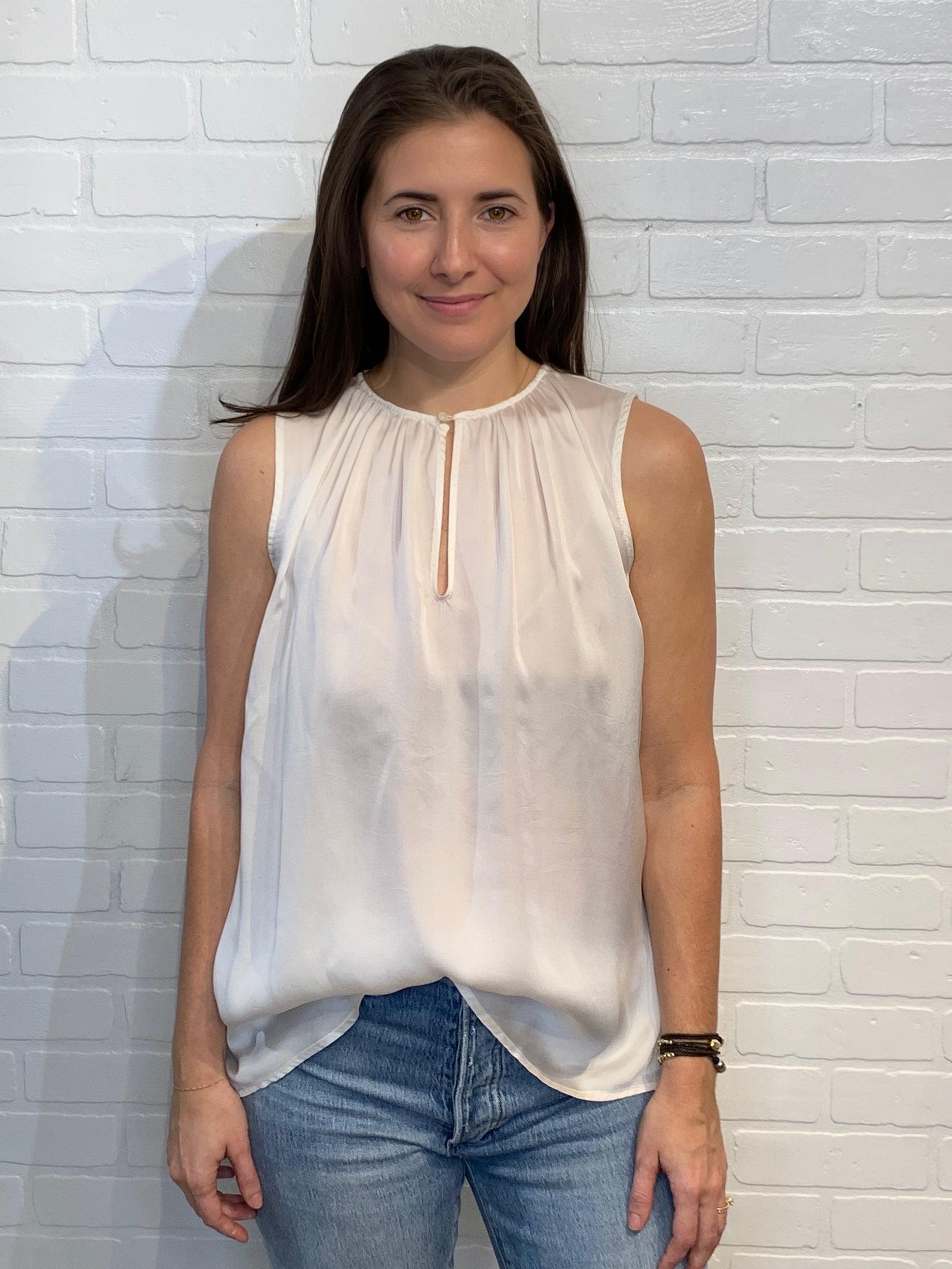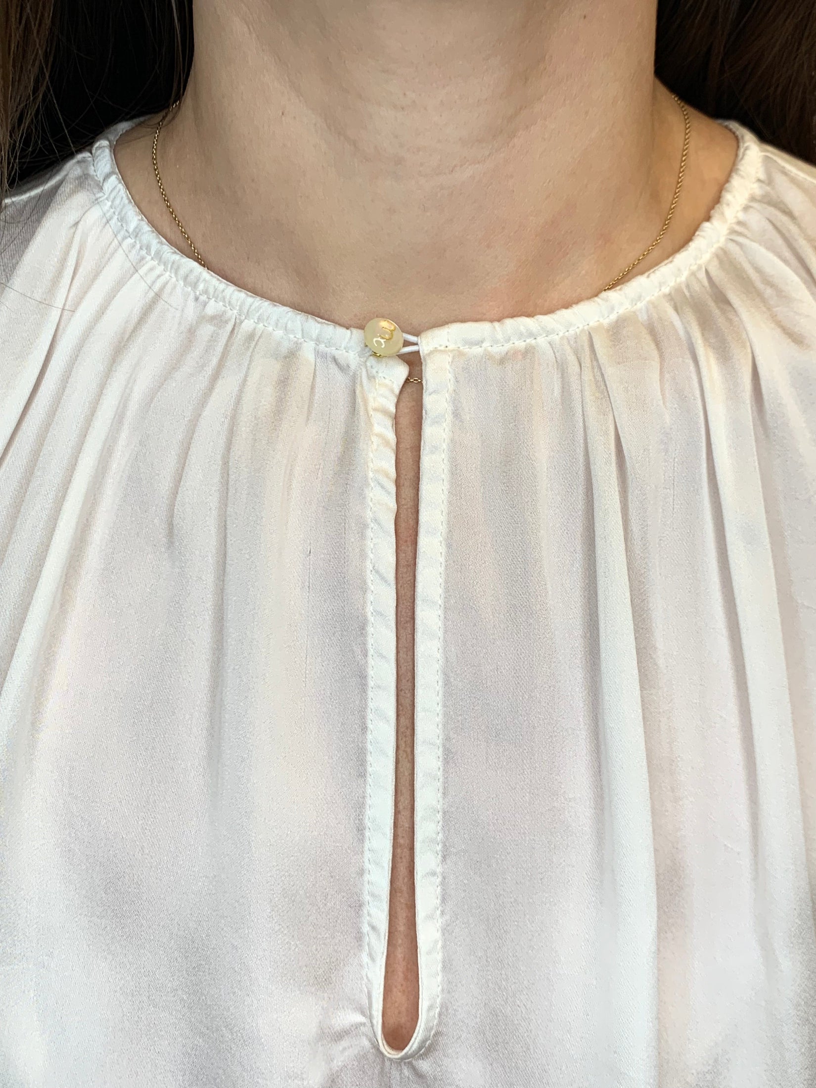 Garment dyed pure silk round neck top with gathers front and back, keyhole opening fastened with small button. Cris is ideal as a cool summer top or under a jacket.